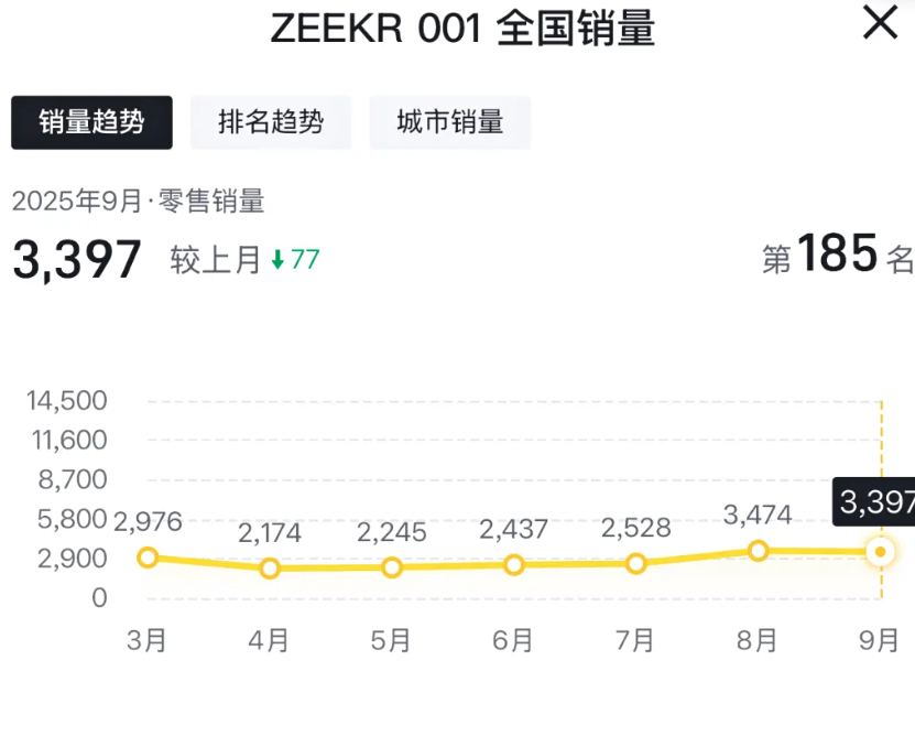 再看销量,根据第三方数据显示,2025年1-9月,极氪001单月零售销量在2174台到4359台之间,9月销量3397台。但作为极氪的“开山之作”,在全球40多个国家和地区销售,猎装系列全球保有量超30万辆,由此可见极氪001在国内汽车市场的销量还有很大的发展空间。