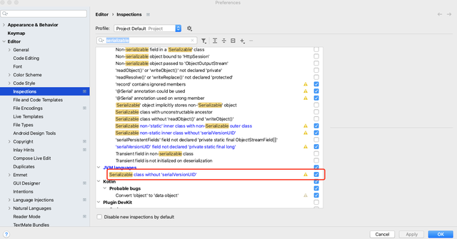 搜索【serializable】找到JVM language下的,如图所示然后勾选,apply后便可以了。