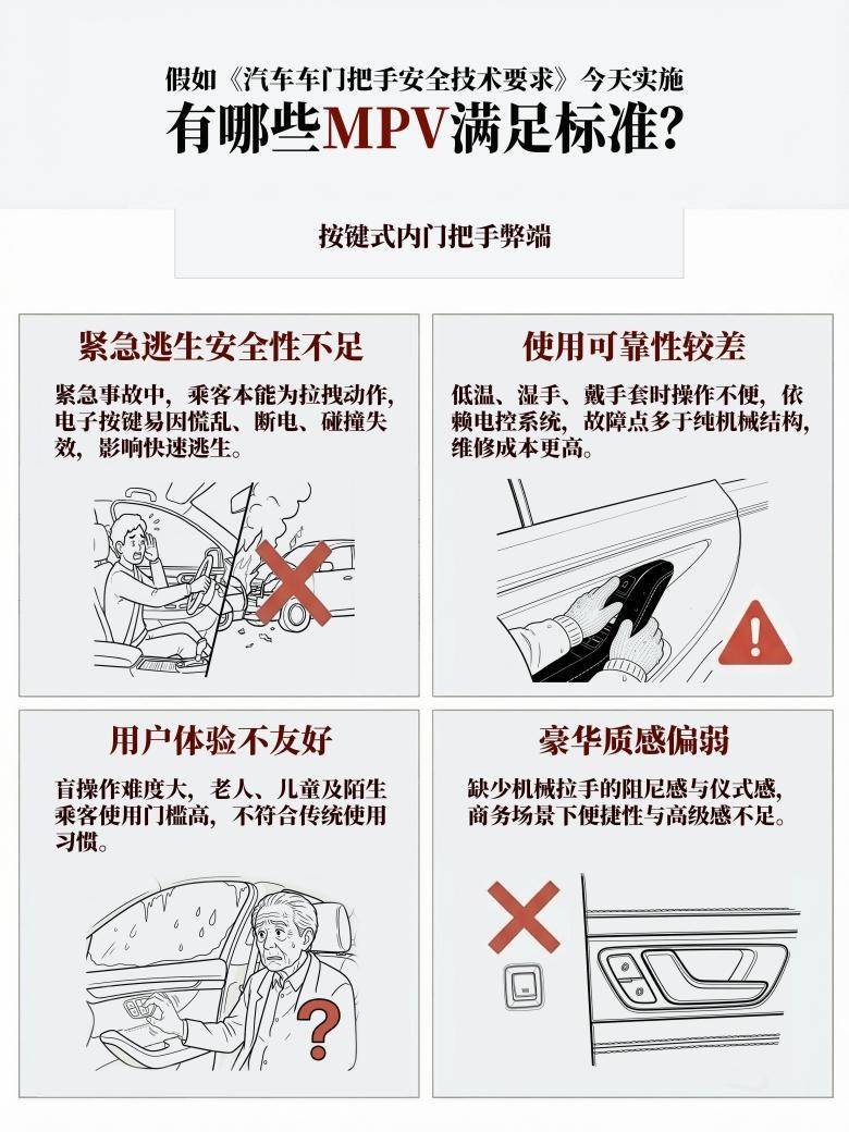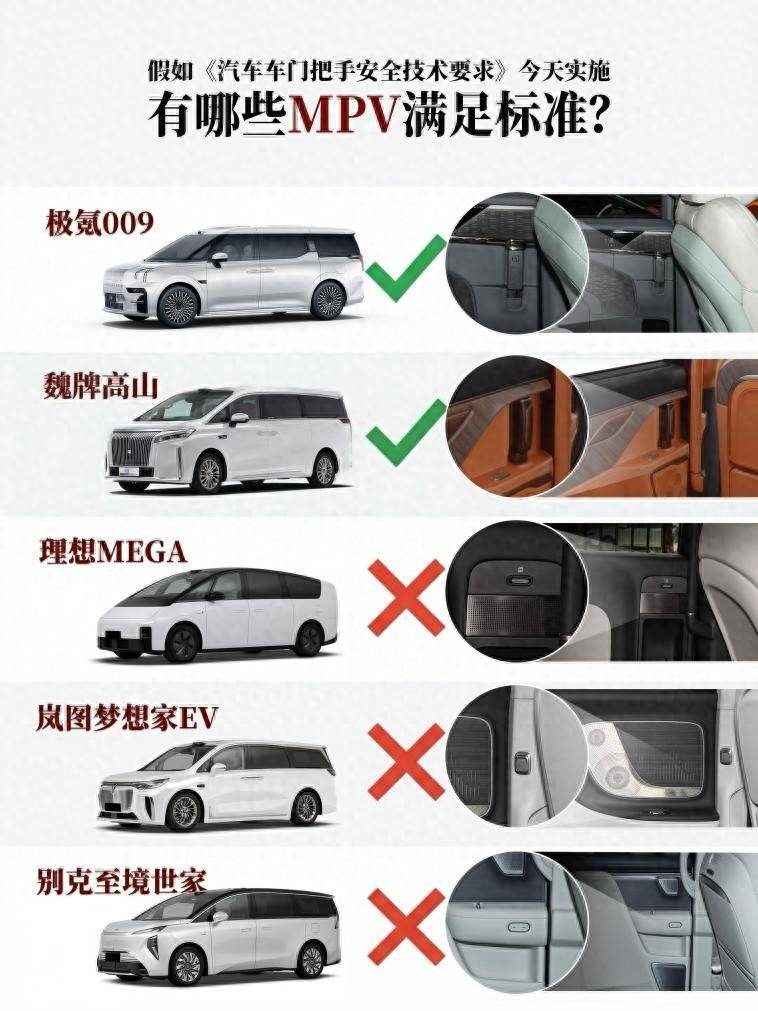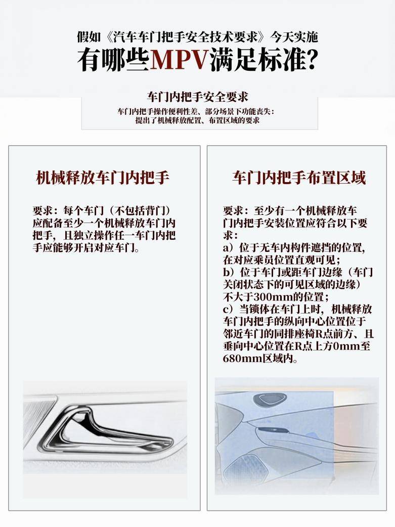 热知识+12027年1月1日起,车门把手新国标就要强制执行了。准备买MPV车主快看过来,毕竟是关乎安全的大事。快看看符合