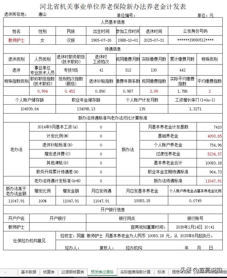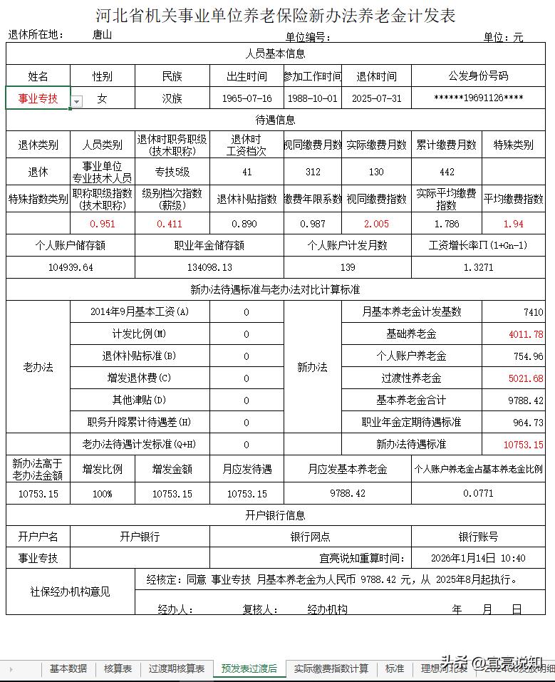 二、事业专技身份的退休人员待遇所需部分参数的计算过程如下:
