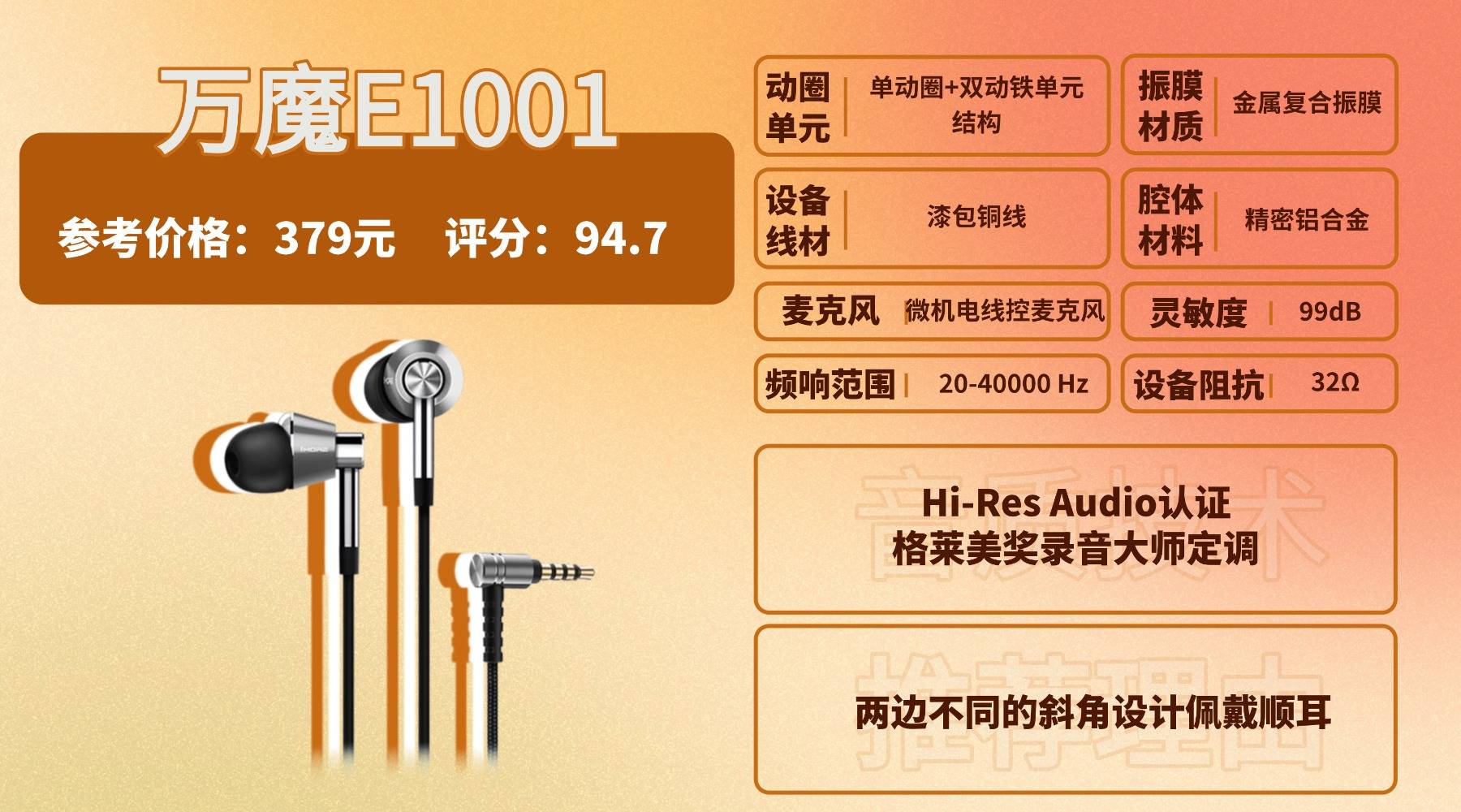 E 10 01 采用单动圈 + 双动铁三单元组合,并使用金属复合振膜,调音风格偏温和耐听,初听不会特别惊艳,但煲开后中频厚度和整体密度会更好一些。声音走均衡路线,低频不轰、高频不尖,整体听感比较百搭。