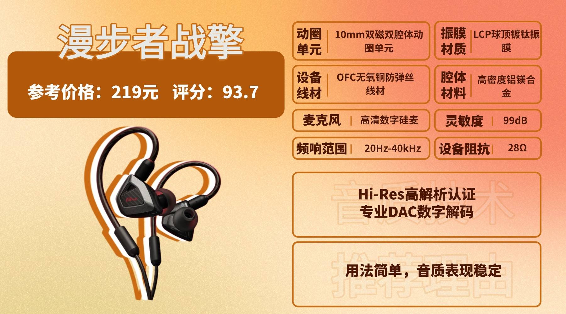 战 擎采用 10mm 双磁双腔动圈单元与 LCP 球顶镀钛振膜,声音定位比较稳重,解析力在百元价位里表现算扎实。听流行、影视配乐、游戏音效都挺顺,低频量感合适,但在特别复杂的曲目里,瞬态速度稍慢一些,力度表现会显得保守。