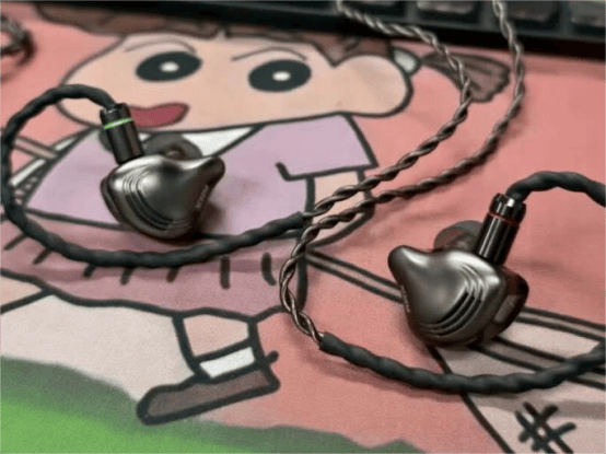 它采用一圈四铁的三分频架构,10mm 碳基振膜负责低频和基础声底,人声呈现自然平顺,是它比较突出的部分,没有刺耳的高频,也没有闷糊的涂抹感。背景层次感相对保守一些,音乐段落较密集时会出现一定重叠,是它的主要短板,整体是偏顺滑、不强调极致解析的路线。面板为液态压铸金属,线材是 4 股铜镀银,基本布局扎实,但细节处理上依旧能看到胶水痕迹,加上镜面容易划的问题,耐用性与精致度表现一般。耳机没有麦克风功能,偏向纯听感用途。整体而言,JH5 声音风格耐听好上手,佩戴舒服,但做工细节和功能性会稍逊一步。