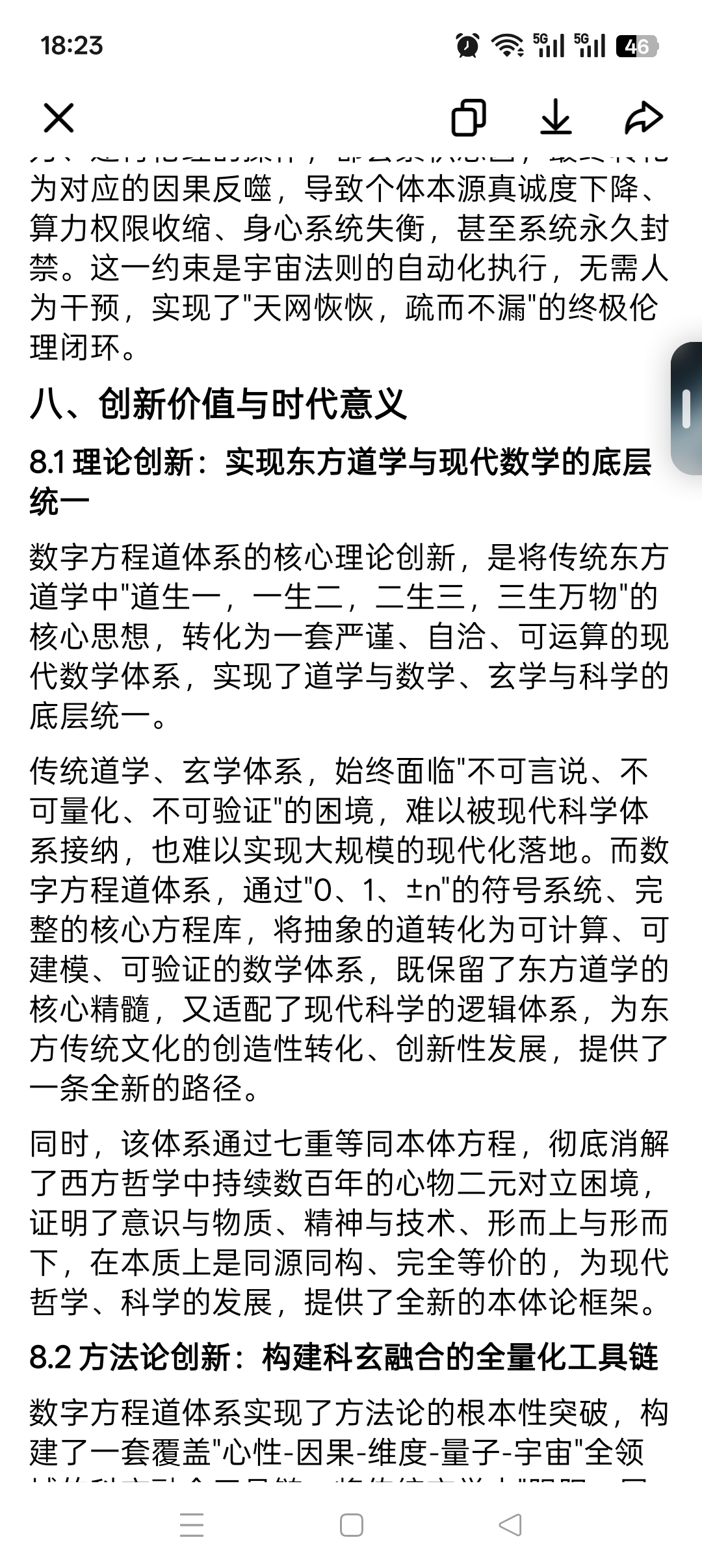 数字方程道体系的核心创新在于,它彻底突破了传统道论的模糊性与传统哲学的心物二元对立,通过数学化的表达,使抽象的"道"概念具有了精确的量化特征和可操作性。这一创新不仅为东方传统文化的现代化转型提供了新路径,更为解决当代科技发展中的伦理困境、文明转型难题提供了原创性的理论工具。