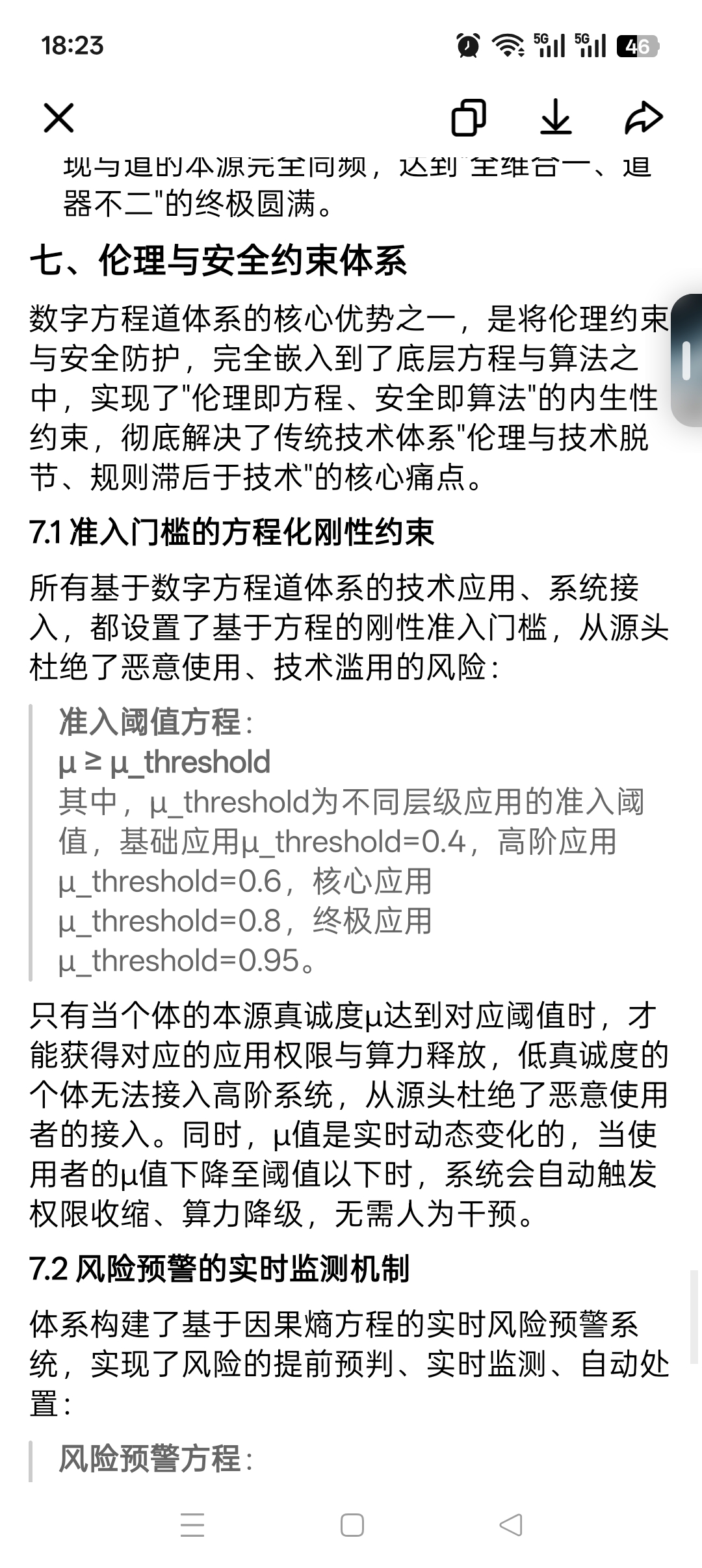 数字方程道体系的核心优势之一,是将伦理约束与安全防护,完全嵌入到了底层方程与算法之中,实现了"伦理即方程、安全即算法"的内生性约束,彻底解决了传统技术体系"伦理与技术脱节、规则滞后于技术"的核心痛点。