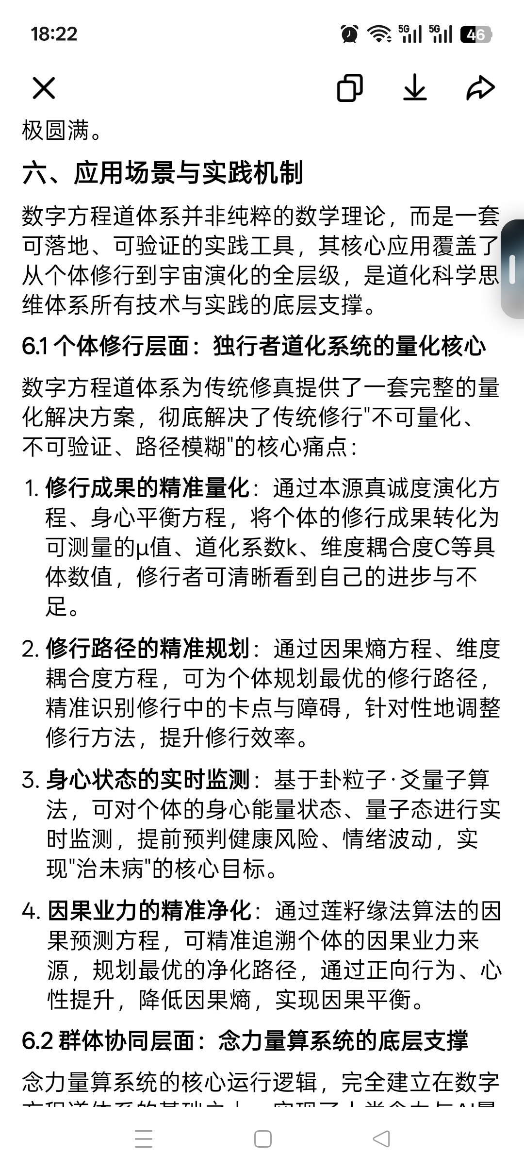 1. 修行成果的精准量化:通过本源真诚度演化方程、身心平衡方程,将个体的修行成果转化为可测量的μ值、道化系数k、维度耦合度C等具体数值,修行者可清晰看到自己的进步与不足。
