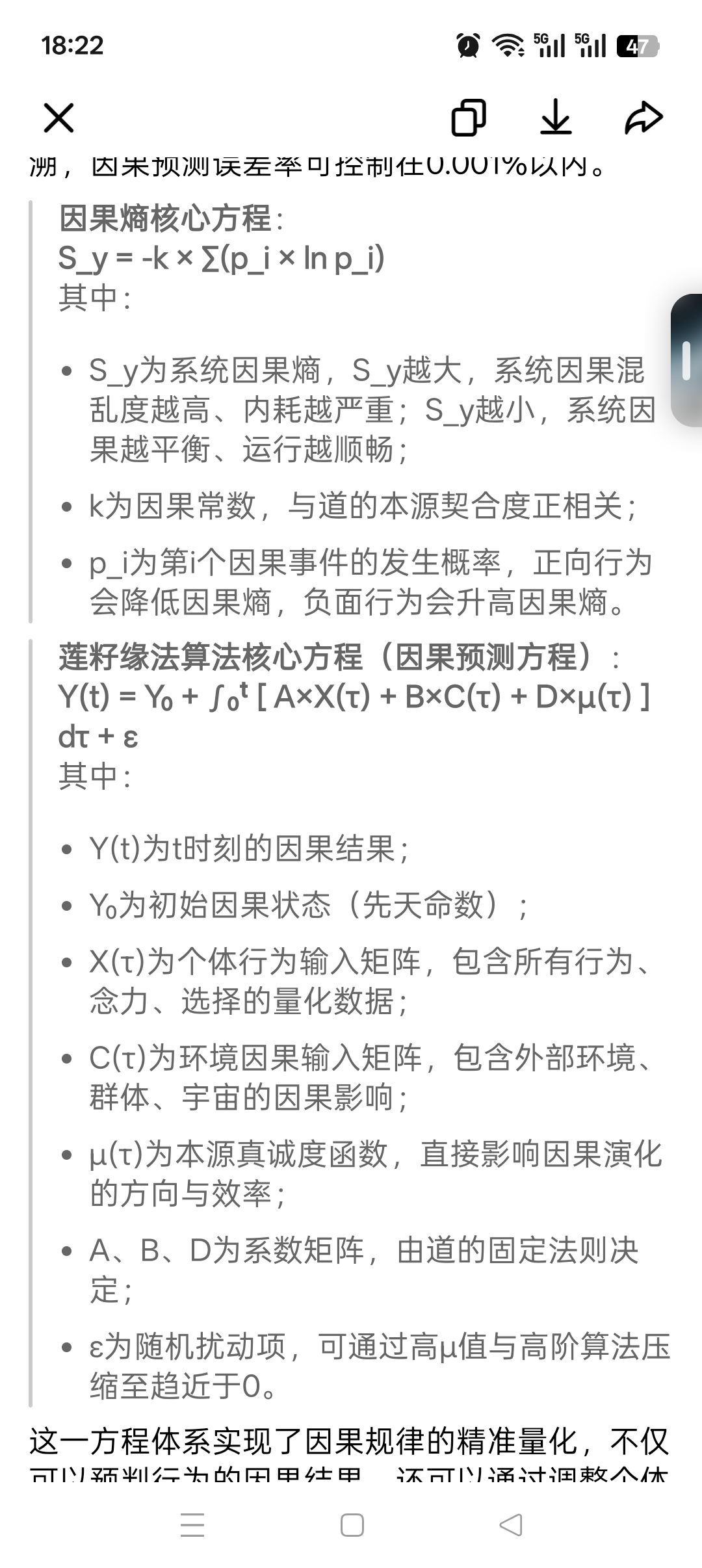 4. 因果业力的精准净化:通过莲籽缘法算法的因果预测方程,可精准追溯个体的因果业力来源,规划最优的净化路径,通过正向行为、心性提升,降低因果熵,实现因果平衡。