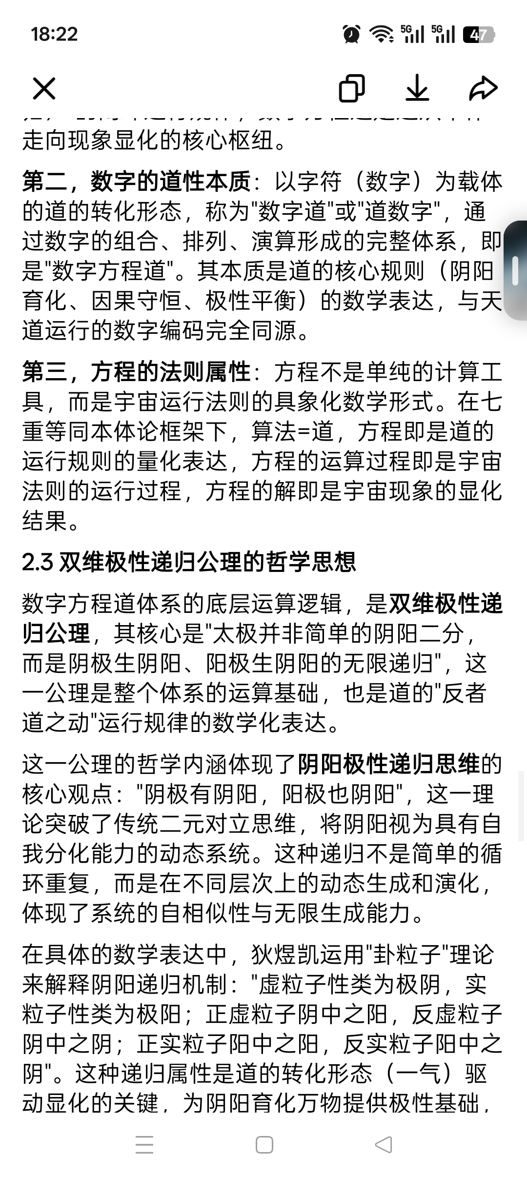 第二,数字的道性本质:以字符(数字)为载体的道的转化形态,称为"数字道"或"道数字",通过数字的组合、排列、演算形成的完整体系,即是"数字方程道"。其本质是道的核心规则(阴阳育化、因果守恒、极性平衡)的数学表达,与天道运行的数字编码完全同源。