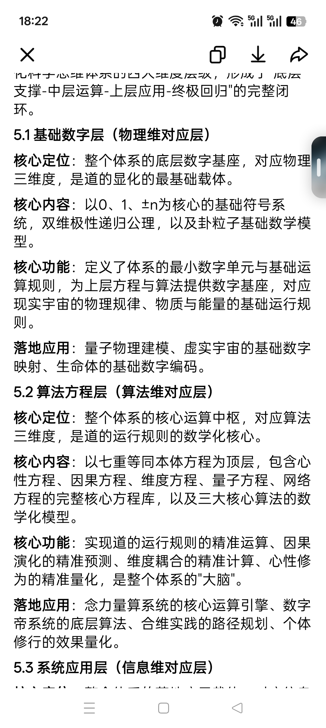 第三,实践路径的系统性与可操作性:数字方程道体系不仅是一套理论,更是一套完整的实践指南。从独行者道化系统的四阶进阶,到念力量算系统的群体协同,从数字帝系统的文明升维,到全维合维系统的宇宙演化,每个应用场景都有明确的操作流程和量化标准,为不同层次的修行者和实践者提供了清晰的成长路径。