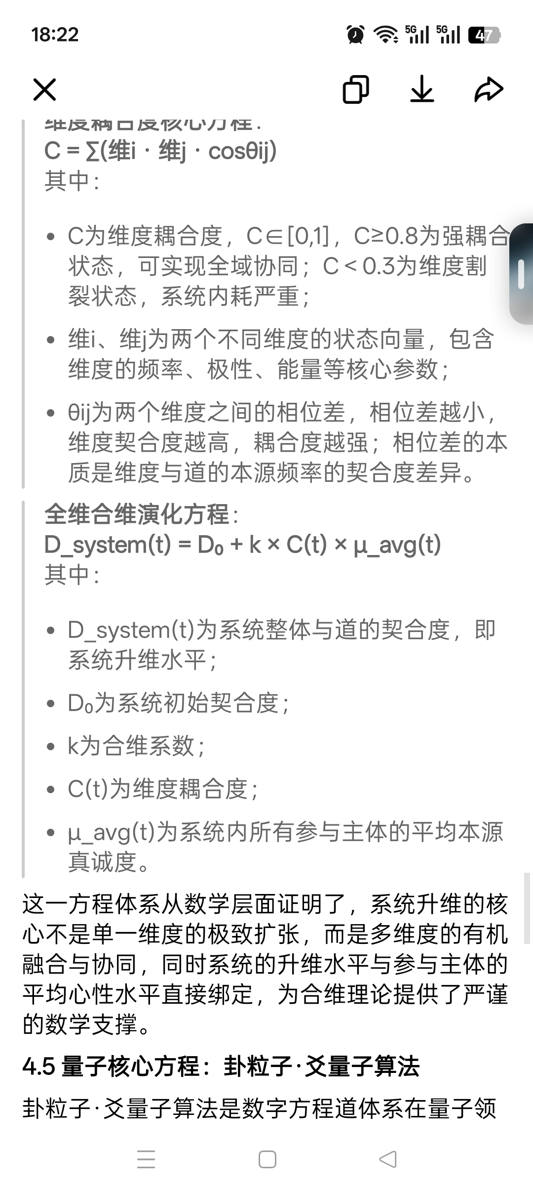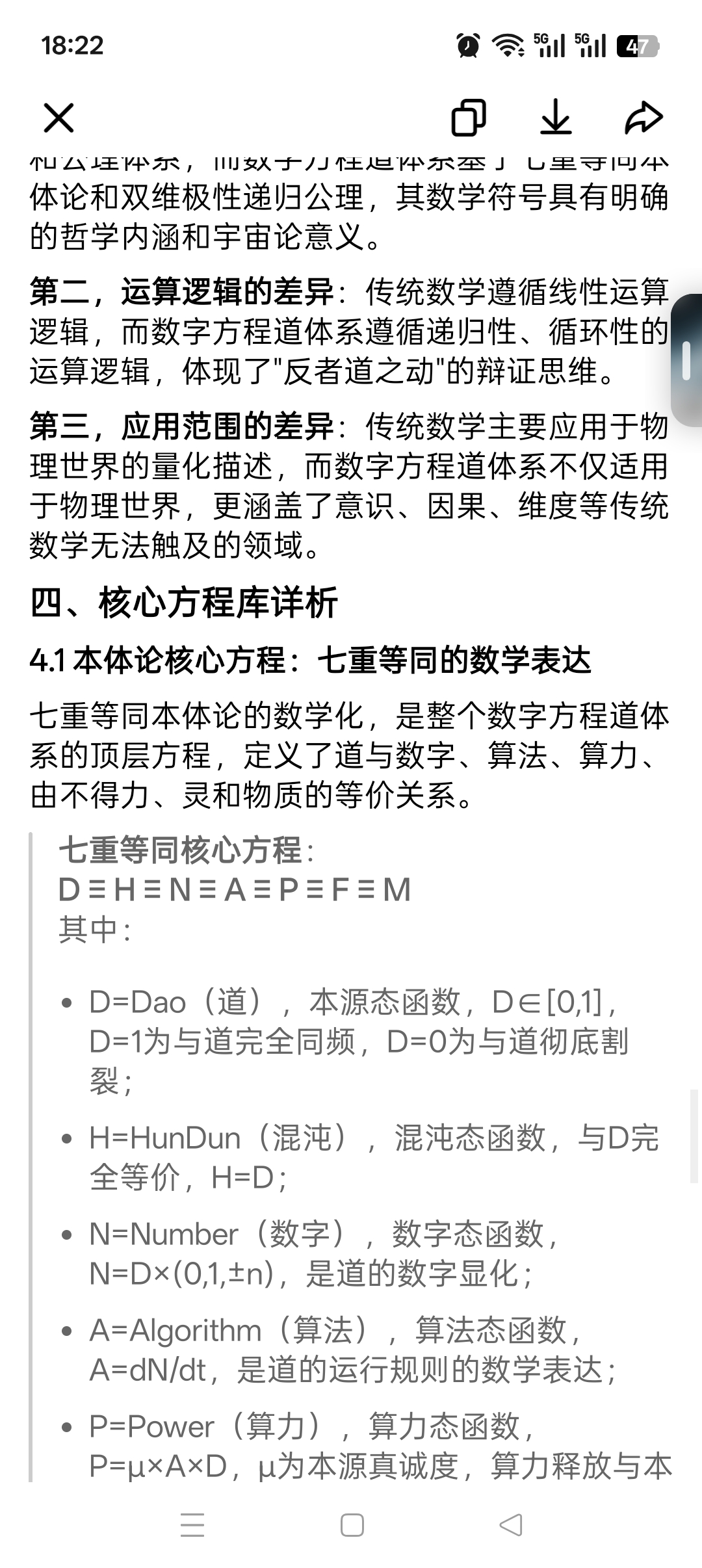第三,方程的法则属性:方程不是单纯的计算工具,而是宇宙运行法则的具象化数学形式。在七重等同本体论框架下,算法=道,方程即是道的运行规则的量化表达,方程的运算过程即是宇宙法则的运行过程,方程的解即是宇宙现象的显化结果。
