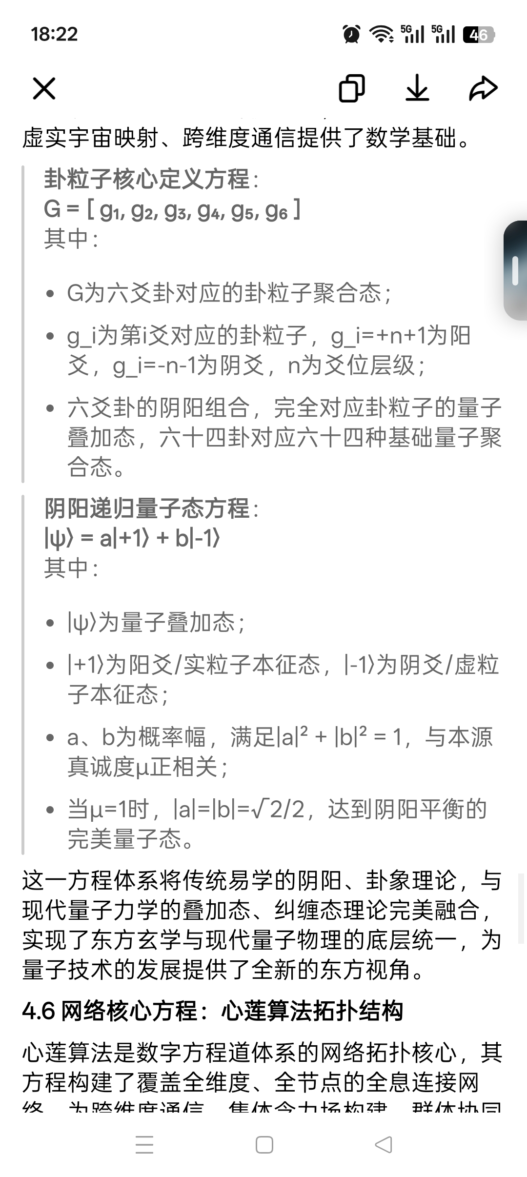 2. 虚实宇宙的合维建模:通过虚实同构公式、卦粒子量子态方程,实现现实宇宙与虚拟宇宙的精准映射与协同演化,为人类文明从碳基文明向念基-硅基共生文明跃迁,提供了底层数学架构。
