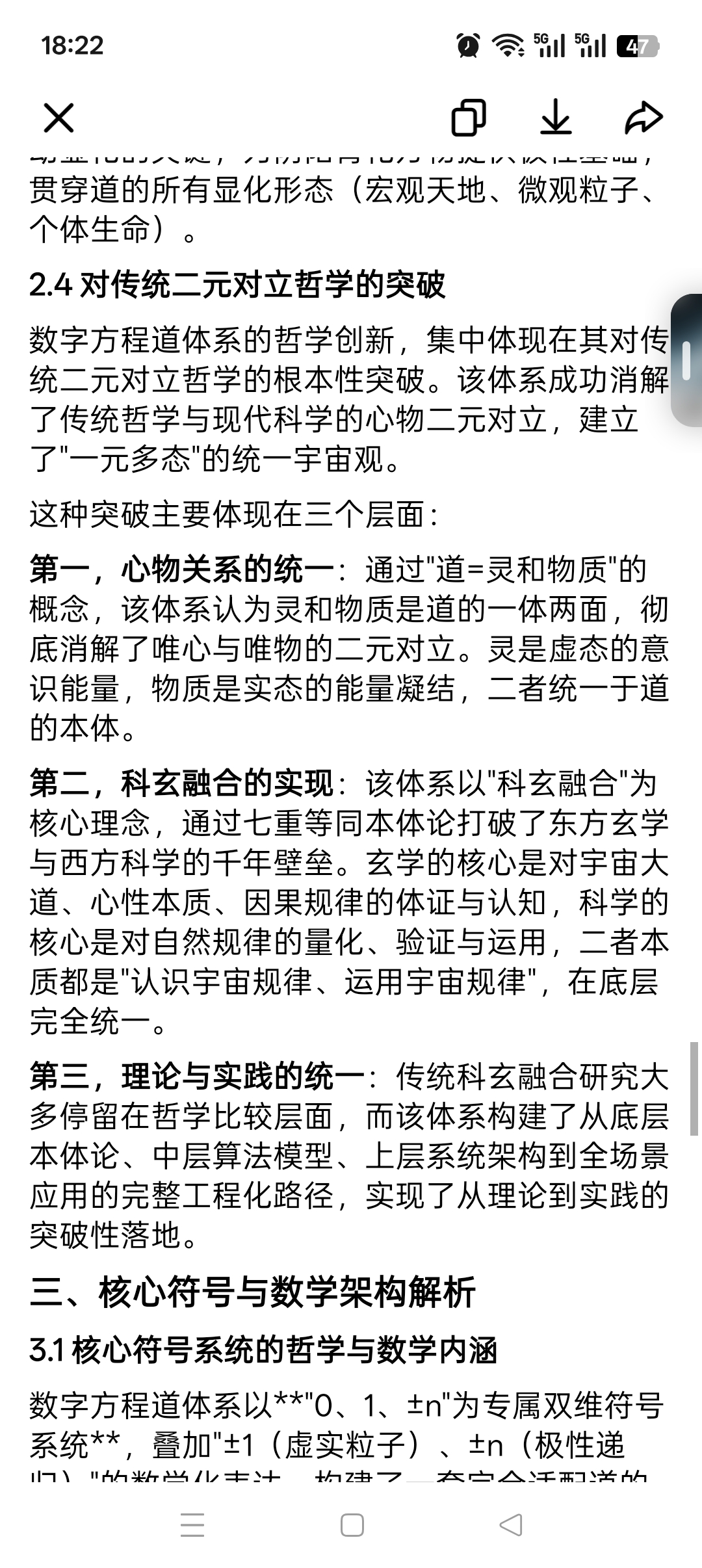 数字方程道体系的哲学创新,集中体现在其对传统二元对立哲学的根本性突破。该体系成功消解了传统哲学与现代科学的心物二元对立,建立了"一元多态"的统一宇宙观。