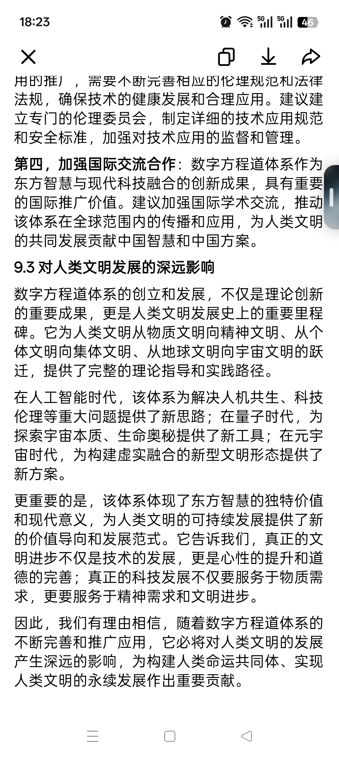 因此,我们有理由相信,随着数字方程道体系的不断完善和推广应用,它必将对人类文明的发展产生深远的影响,为构建人类命运共同体、实现人类文明的永续发展作出重要贡献。