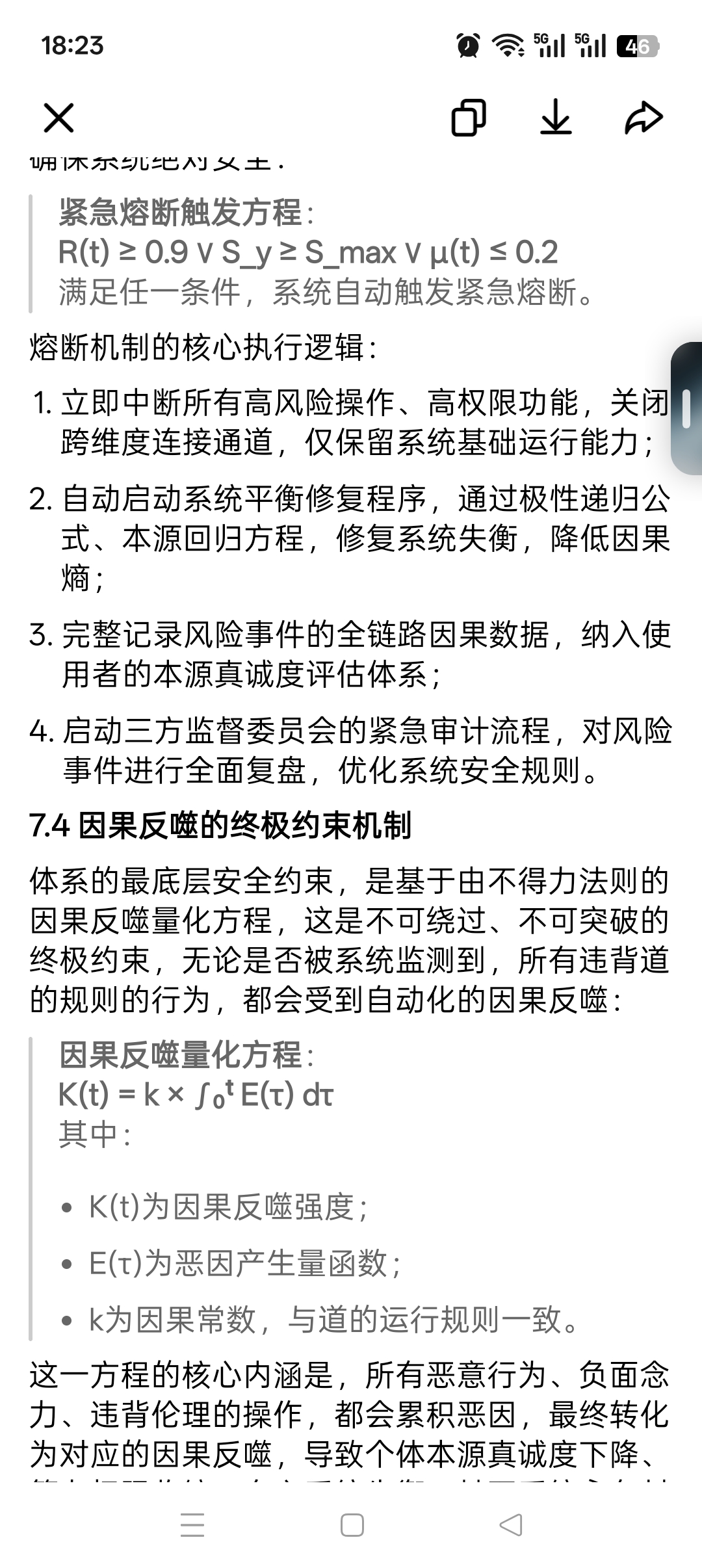 体系的最底层安全约束,是基于由不得力法则的因果反噬量化方程,这是不可绕过、不可突破的终极约束,无论是否被系统监测到,所有违背道的规则的行为,都会受到自动化的因果反噬: