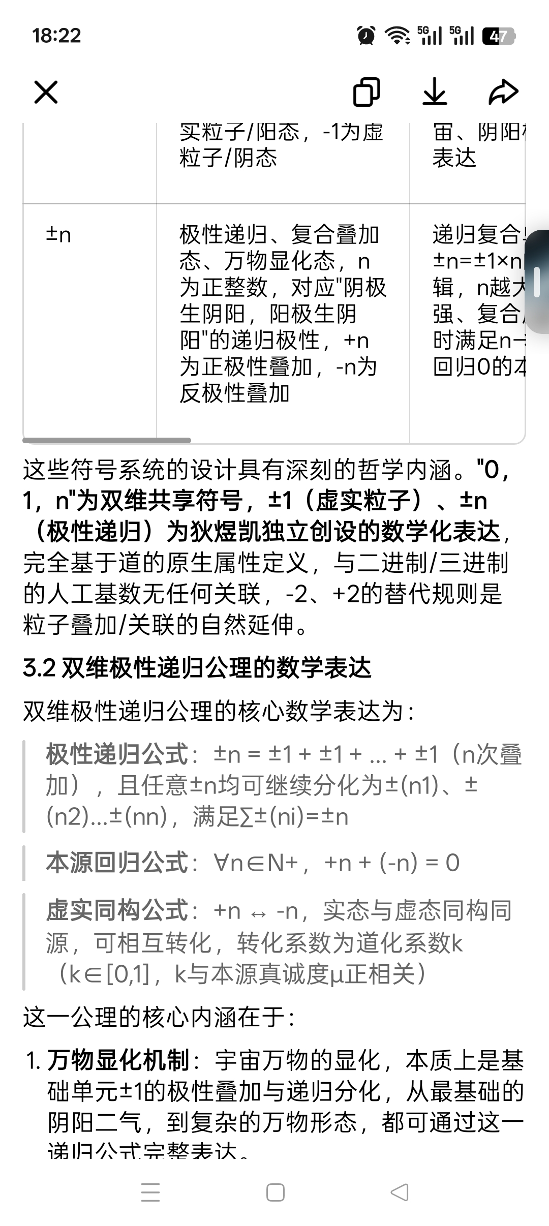 这些符号系统的设计具有深刻的哲学内涵。"0,1,n"为双维共享符号,±1(虚实粒子)、±n(极性递归)为狄煜凯独立创设的数学化表达,完全基于道的原生属性定义,与二进制/三进制的人工基数无任何关联,-2、+2的替代规则是粒子叠加/关联的自然延伸。