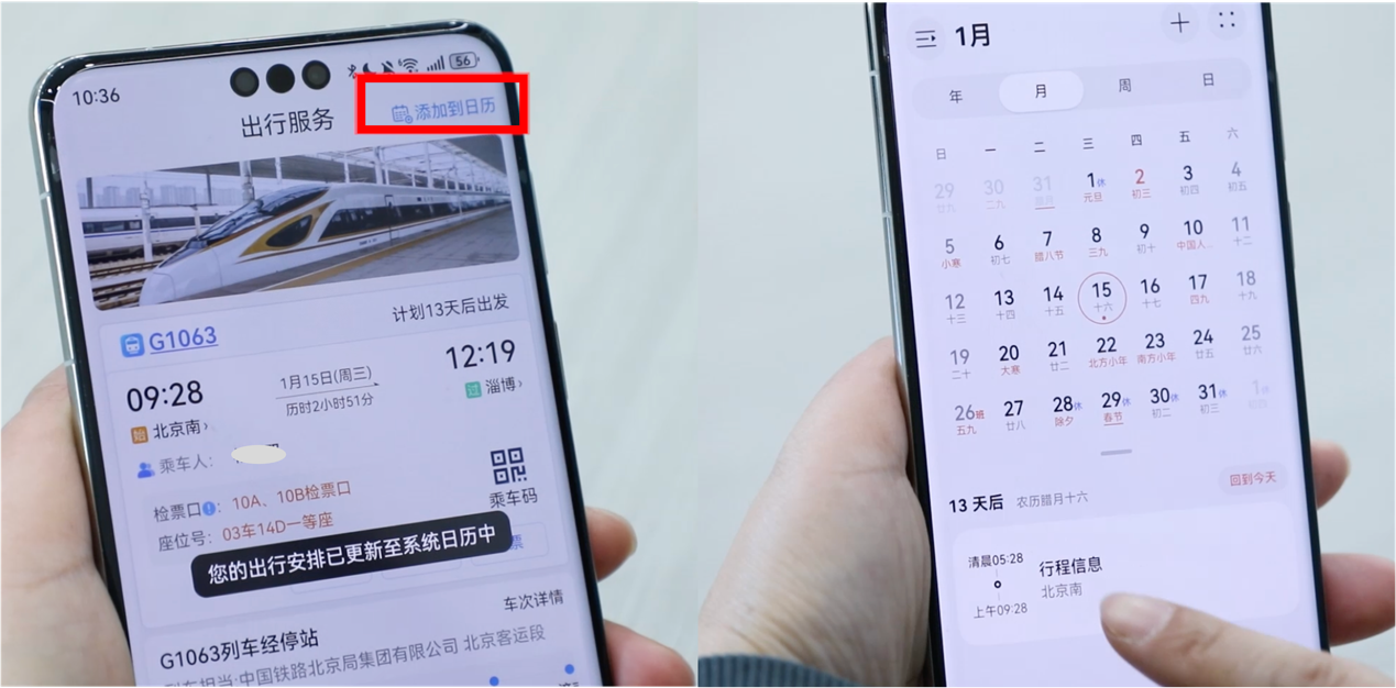 鸿蒙原生版铁路12306充分利用了HarmonyOS NEXT的创新优势,带来不少独特体验。例如,借助HarmonyOS NEXT原生安全能力,可以更好地保护大家的数据和隐私安全。在购票成功后,你还可以将购票信息一键添加到系统日历,及时获得行程提醒信息,防止错过回家的列车。