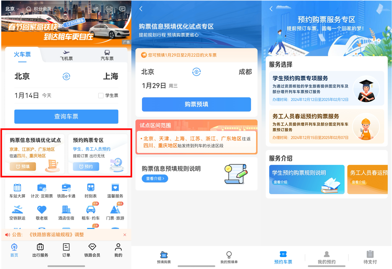 鸿蒙原生版铁路12306支持火车票下单、改签、退票等基础功能,还上线了车站大屏、时刻表、温馨服务等车站服务,以及酒店住宿、门票旅游、租车约车等出行服务,也支持最新上线的学生和务工人员预约购票服务,可以说为春运做足了准备。大家在鸿蒙原生版铁路12306首页,就能看到“预约购票服务专区”的按钮,点击进去,按照提示就能完成预约操作。其中,学生需要大家提前完成学生优惠资质或身份核验,此外学生和务工人员每笔订单支持包括自己在内的9名乘车人一起预约,同学、老乡结伴回家过年也不再是难事!