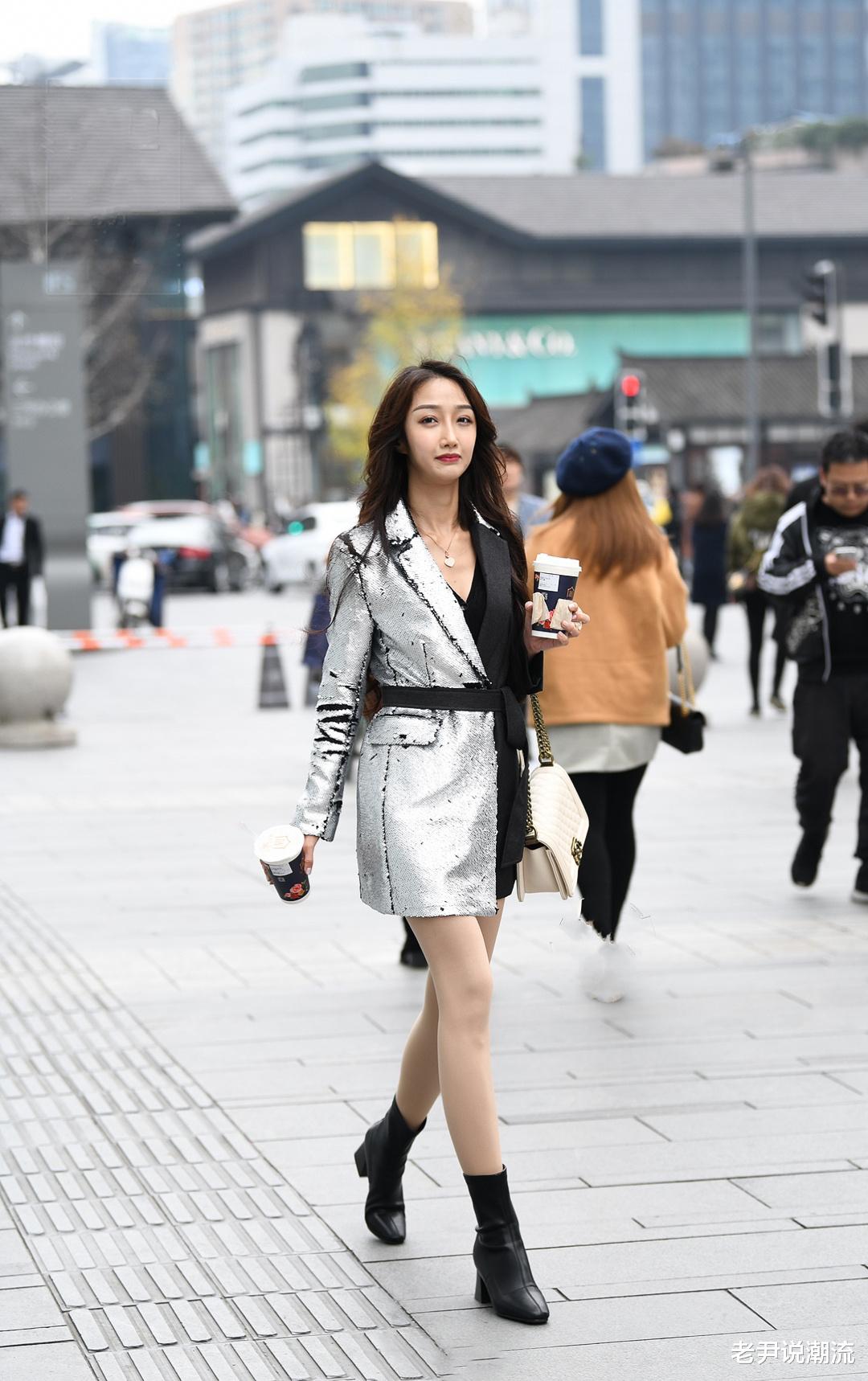 对撞的艺术搭配是很讲究设计者能力的,看美女身着银色亮片对半分的对比色西装外套,兼具干练与精致感,内搭黑色深 V 连衣裙,腰间系黑色腰带凸显腰线;脚穿黑色粗跟短靴,搭配裸色丝袜;米白色链条包中和了色彩,颈间佩戴心形玉质的项链,造型时尚亮眼。