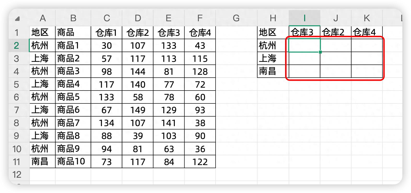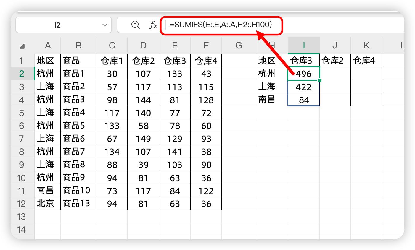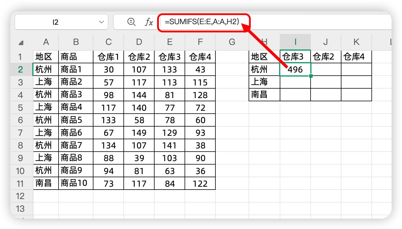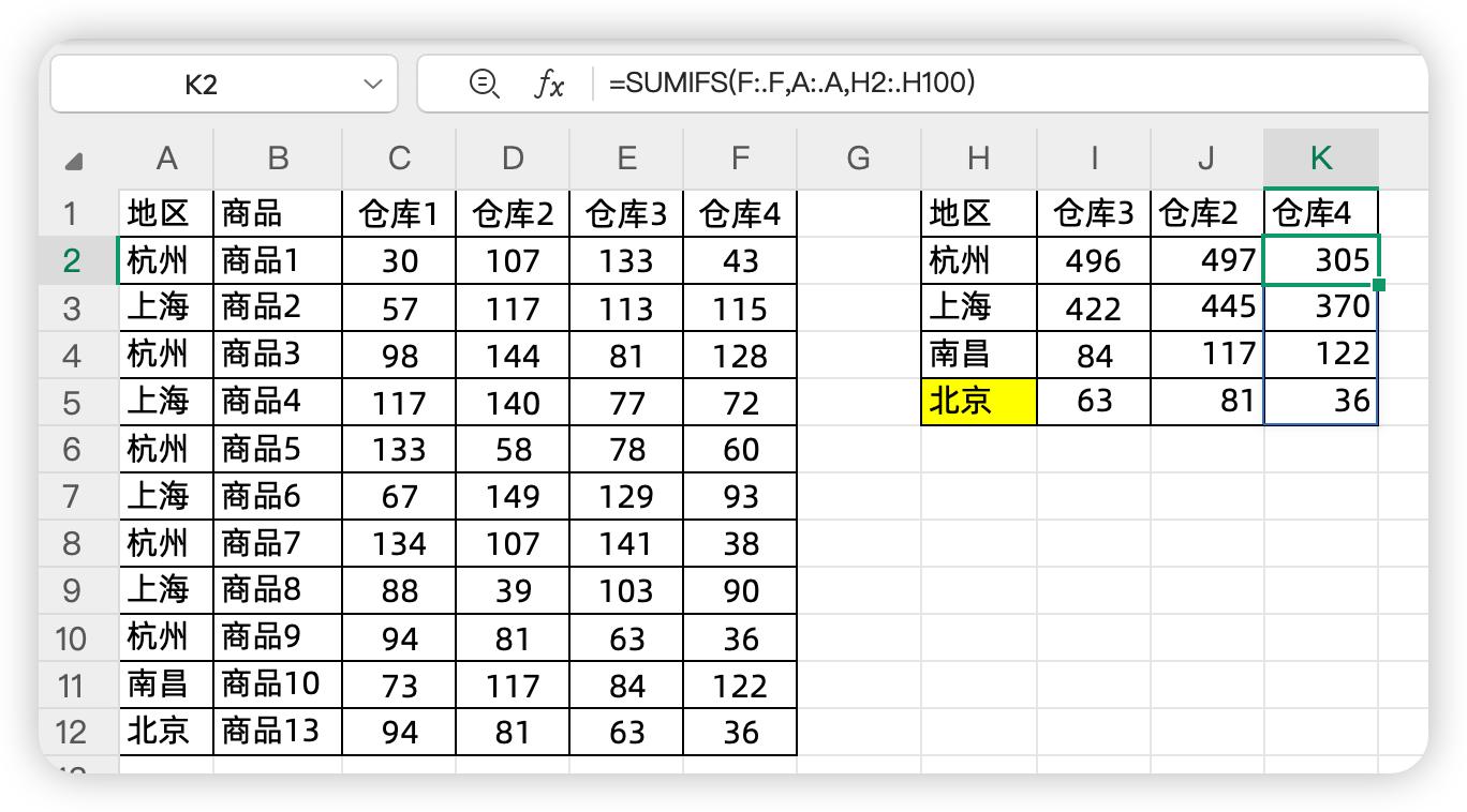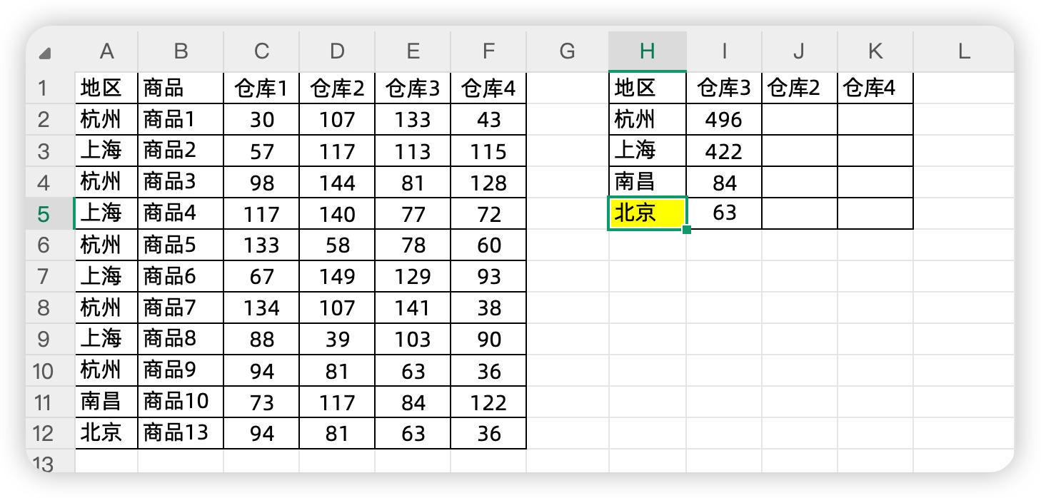 举一个例子,左边是各大区各种商品的库存数据,我们现在需要统计某些大区,某些仓库的的数量: