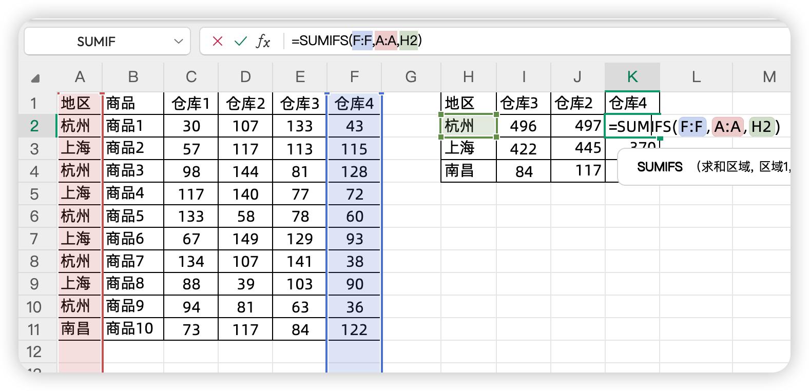 对于仓库4的汇总,那就是将求和列变成F列,继续使用公式: