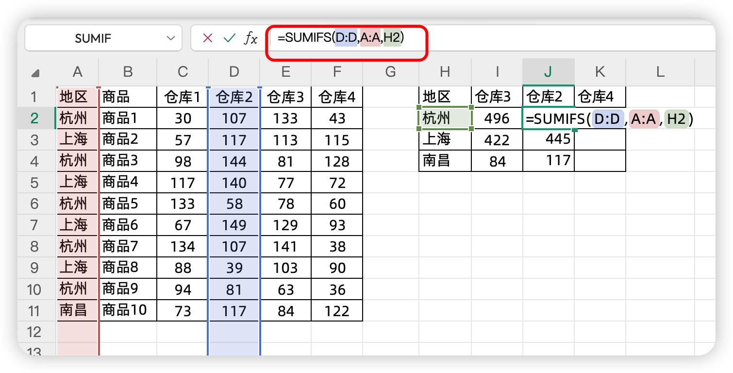 对于仓库2,那就是求和的列变成了D列,继续使用公式: