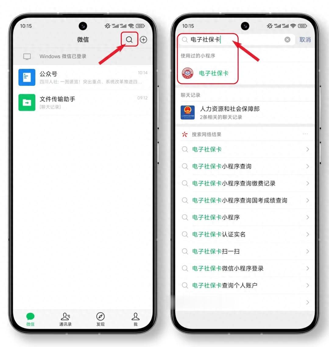 在手机中打开“微信”,点击微信顶部搜索图标,输入“电子社保卡”,点击进入“电子社保卡小程序”。