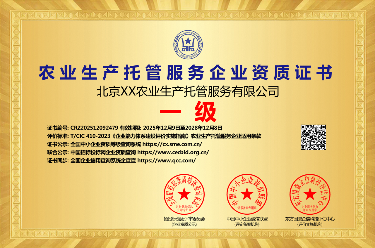 我们常做的农业生产托管服务,包括不限于耕地、播种、育苗、施肥、灌溉、植保、收割、脱粒、烘干、仓储、秸秆处理以及农机作业调度、技术指导等服务,都需要这份合规资质背书。它不仅是甲方认可的“硬底气”,更是招投标、承接大项目的必备前提,全国可查、权威认证,不用自己跑繁杂部门,省心又靠谱。
