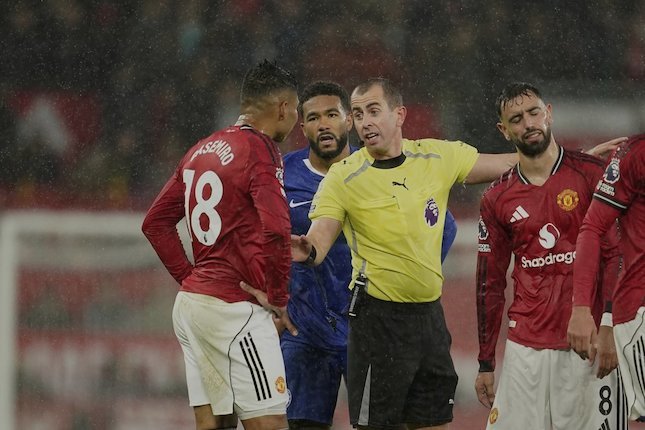 曼联球员卡塞米罗在老特拉福德对阵切尔西的比赛中与裁判彼得·班克斯交谈。(c) AP Photo/Dave Thompson