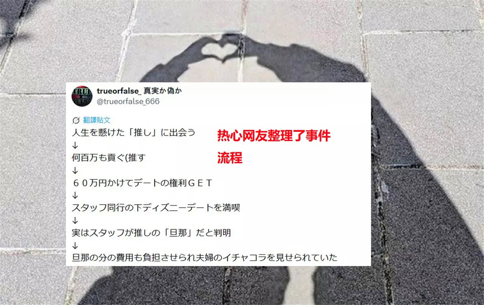 按理说,所谓的约会应该是两个人的事情,而约会当天却来了一个“第三者”,根据“远月之うか”的解释,其是工作人员,既是为了自己的安全,又可以为两人拍照,“Nino”不疑有他,欣然接受了。可是事后他发现:那位工作人员居然就是女偶像的老公!当时玩得有多开心,后来就有多难受!最爱的偶像不仅仅隐瞒了婚姻,陪同她的工作人员是她的丈夫,最后由粉丝承担了三人在迪士尼游玩的费用,大冤种啊!