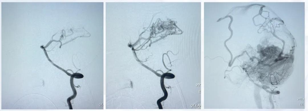 患者为少量出血,出血部位表浅,血管造影提示出血部位为小型动静脉畸形,供血动脉分支明确,引流静脉经海绵窦、翼状窦、乙状窦至上矢状窦。