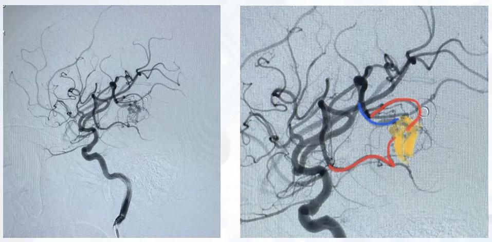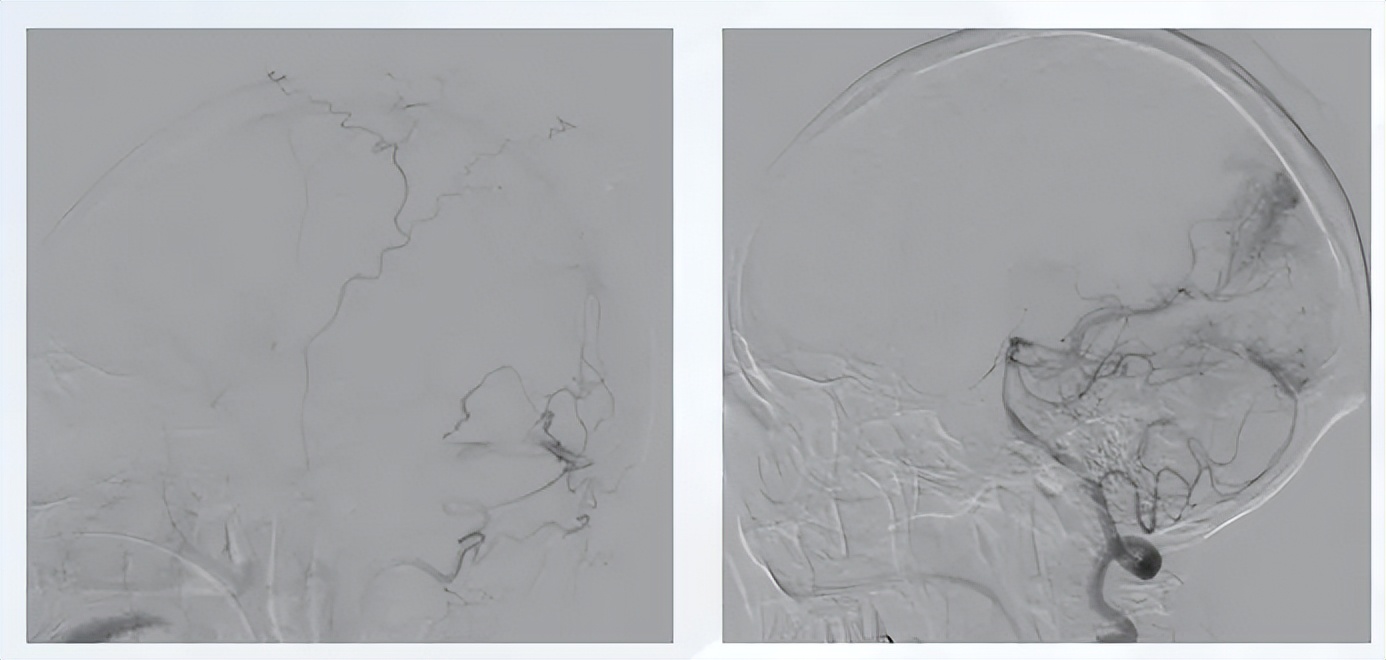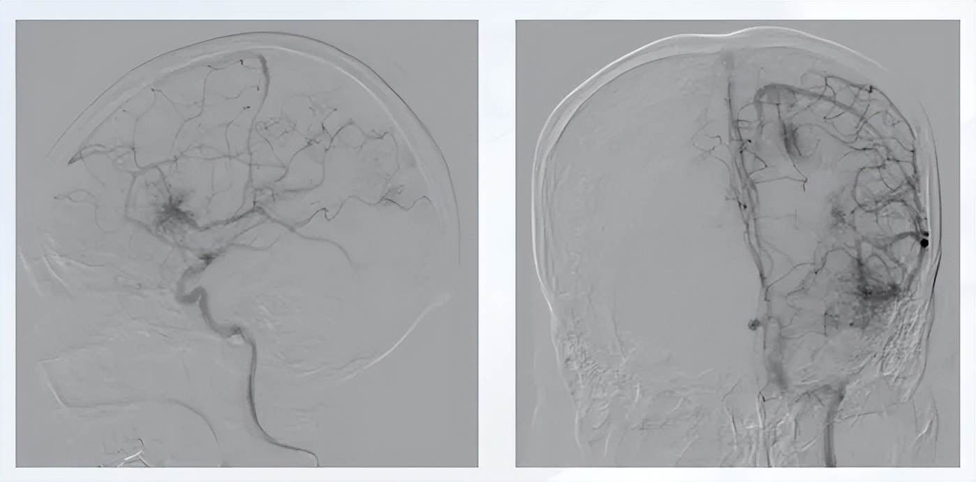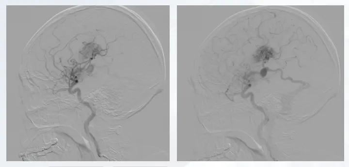 预后:术后患者神志清楚,颅内情况稳定,术前肢体瘫痪症状明显改善,下肢肌力恢复至2~3级,上肢肌力1~2级。术后1个月复查脑血管造影,显示右侧畸形团已切除,未见残留显影。患者后续仍需定期随访与康复训练。