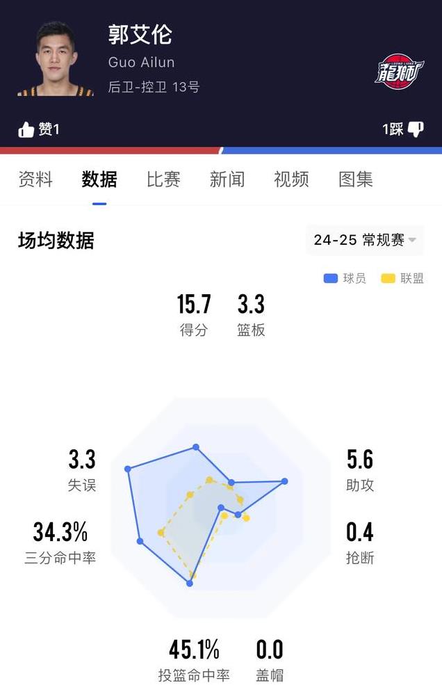郭艾伦本赛季场均出场26.9分钟,场均可以拿下15.7分5.6助攻3.3篮板。数据质量方面,他的投篮命中率45.1%,三分球34.3%。