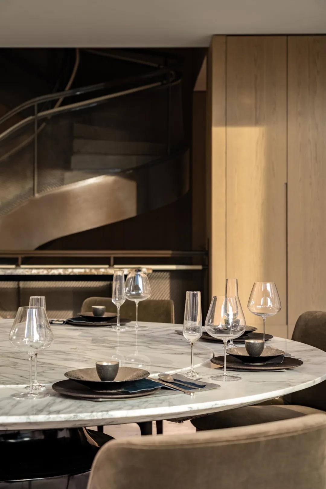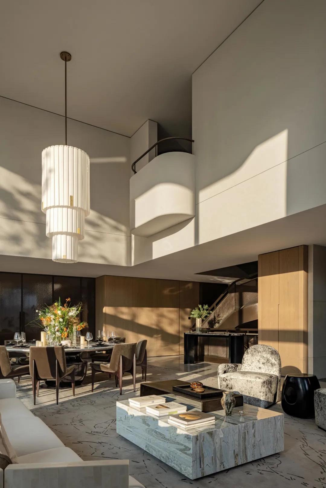 游宴从诗歌创作与交流开始。6.25米挑高的客厅空间,阳光从高处倾泻,将环绕式沙发组、西厨岛台、宴会餐桌依次照亮,它们精准地排列在同一条中轴线上。整面玻璃将庭院引入室内,树影在沙发上缓缓游移,风从室外潜入,带着泥土与青草的气息。在自然与舒适的环境中,主人与宾客都情不自禁地愿意抒发情感,分享思绪,一人在楼下,一人在楼上,隔空对诗,悠扬的声音在挑高的空间里回荡。