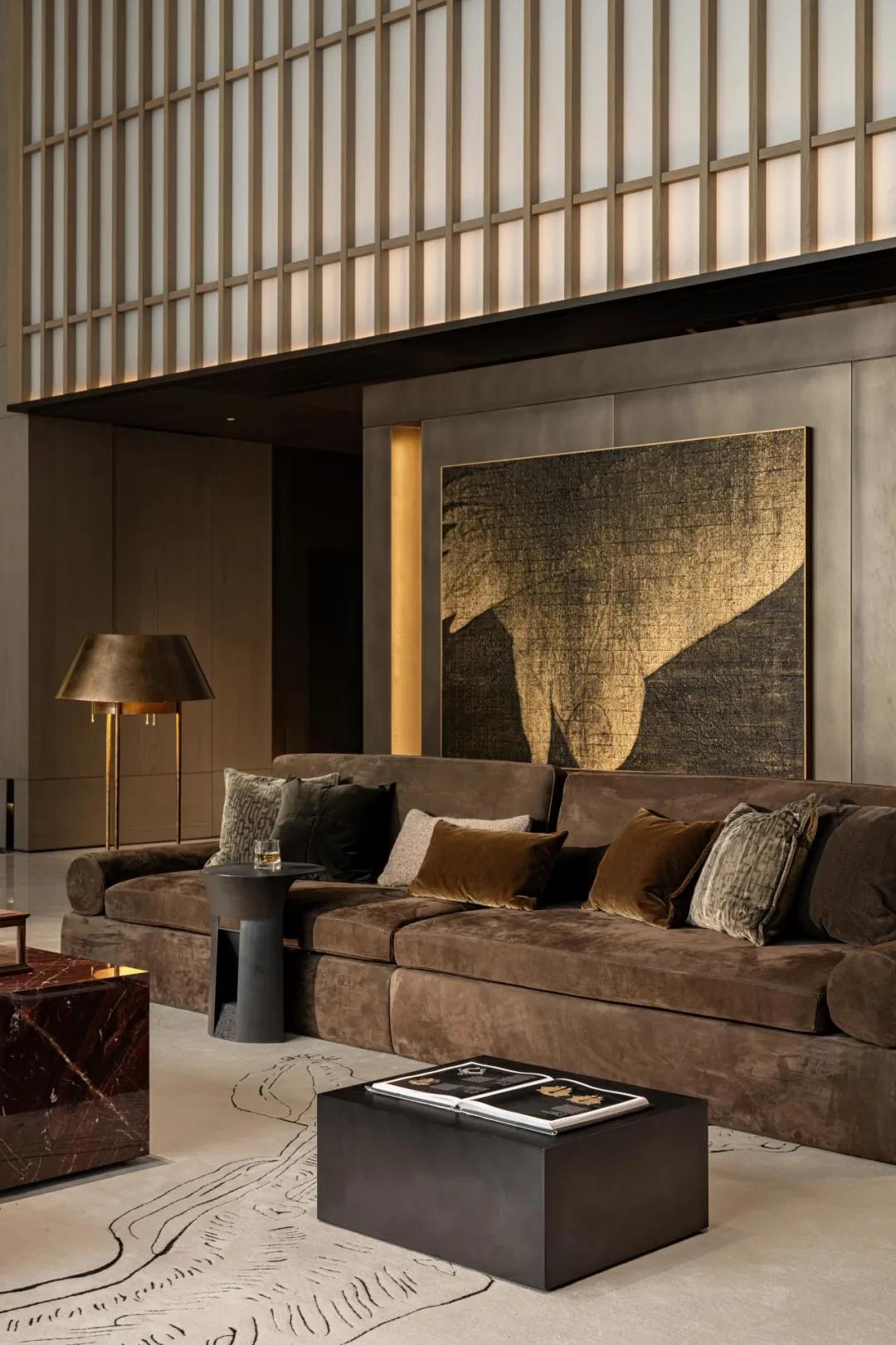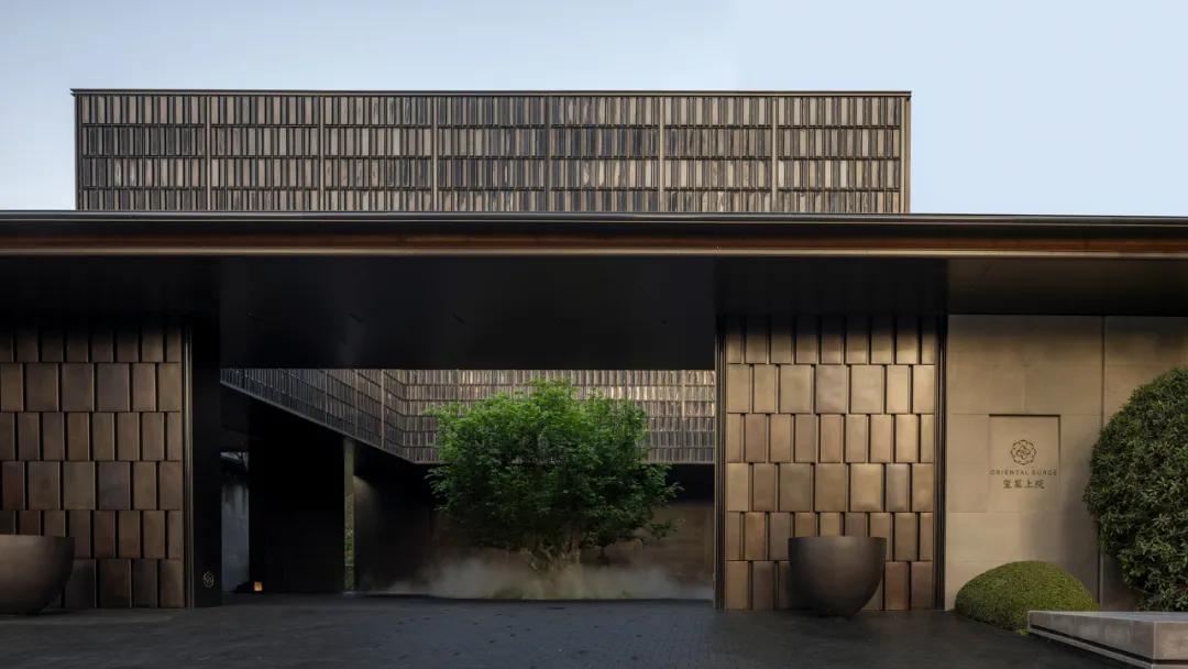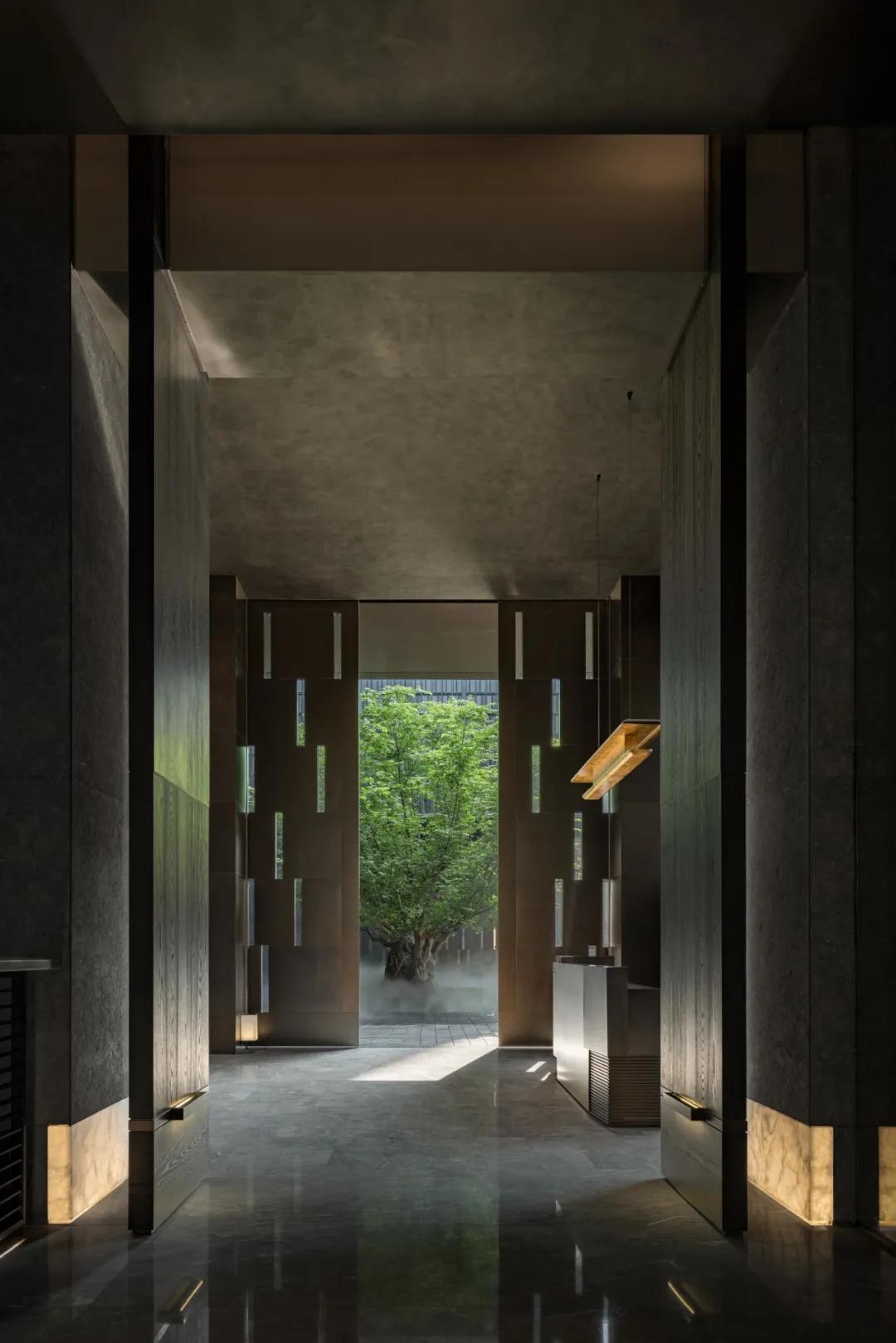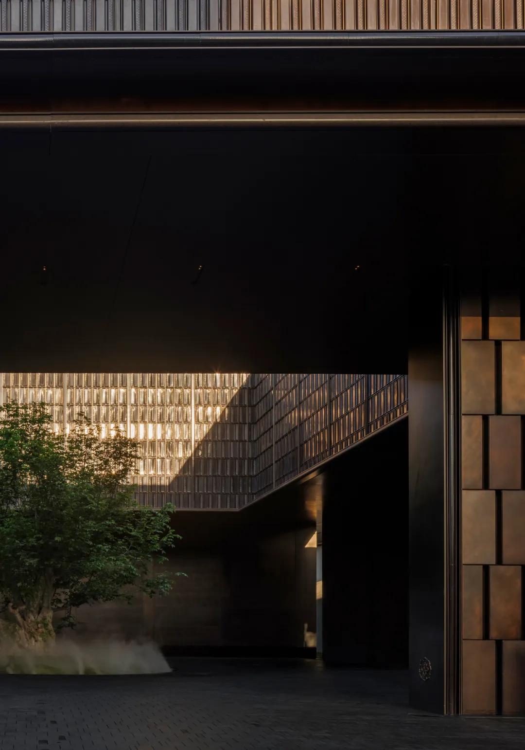晨光初照,青铜大门缓缓开启。门扇上不规则的穿孔透出内部的光影,形成内外空间的对话。六边形瑞士翡翠大理石门把手,凉意触及掌心,似深秋晨露浸润玉石的温度,从指尖向掌心缓慢蔓延。掌心贴合上去的瞬间,历史的大门被悄然推开。情绪的铺陈在此刻完成,欢迎每一位宾客进入一场历史的聚会。