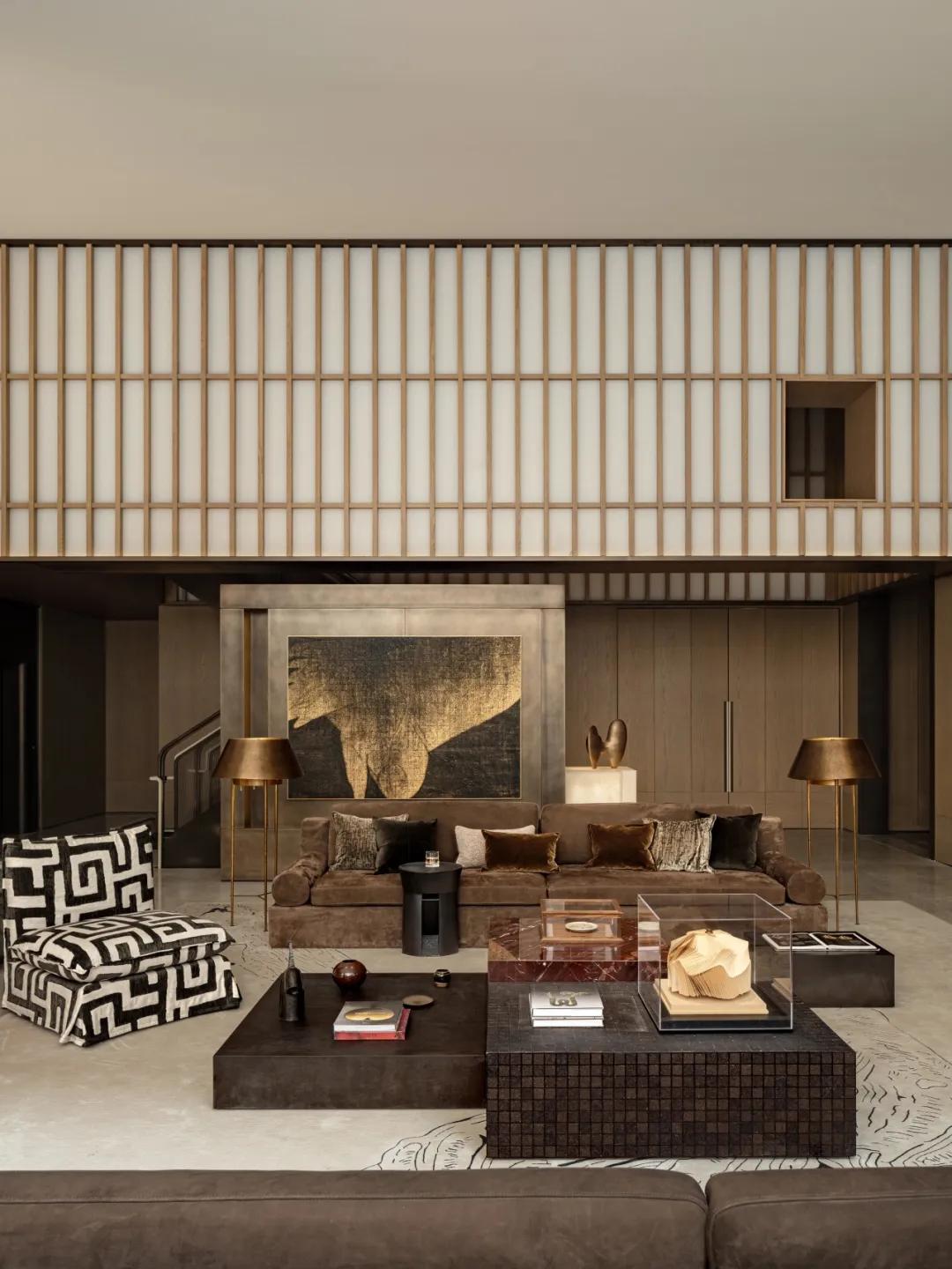 家族收藏的当代艺术品与古董珍玩散落于空间各处,每一件都在光影中静默。当炉火的光晕投射在折角屏风上,明暗交错间,整个空间便有了剧场般的层次。那些藏品被火光映照,轮廓在暖色中变得柔软,与人目光相遇时,仿佛也有了呼吸。中国传统文人美学中的归隐追求,对自然美景的回归,对生活的淡泊态度,对美的不懈追求,在此刻凝聚成真实可触的生活,让我们回归水岸深处最本真的宁静。