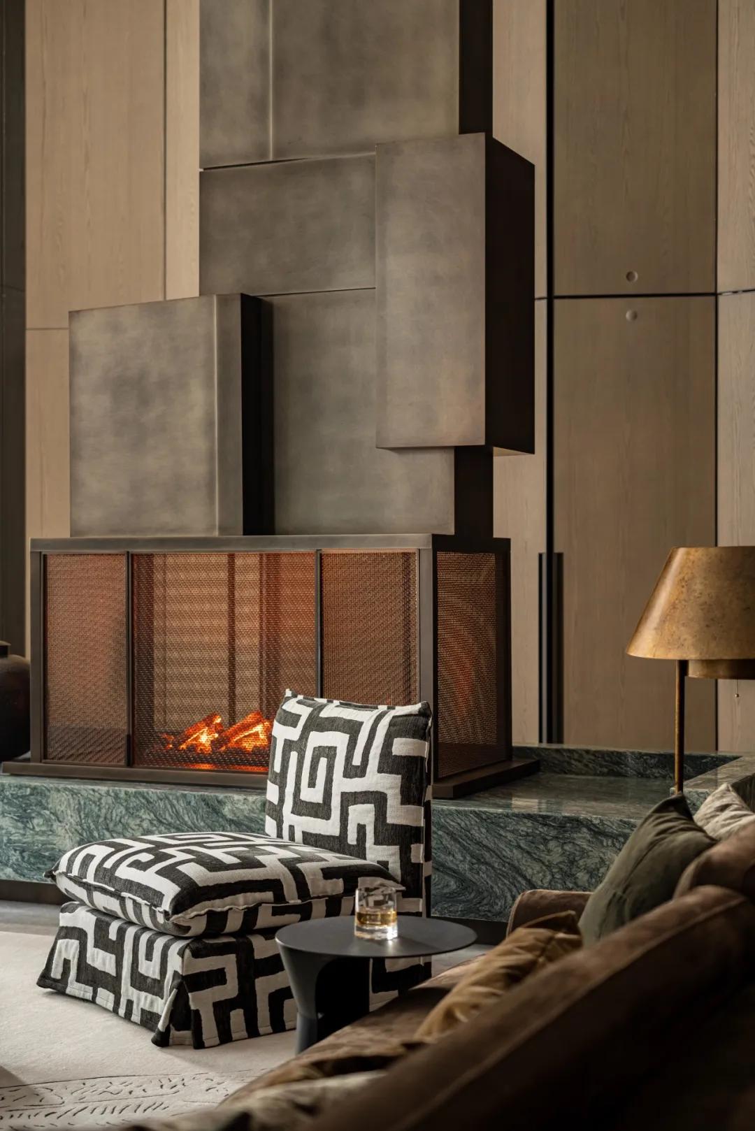 地下沙龙,通高火炉以仿古铜锻造,铜面经过特殊氧化处理,火光在其中跳跃时,那光泽便在铜面上流转,忽明忽暗,如同时光本身的呼吸。围坐在炉火旁,能听见火焰轻微的噼啪声,暖意从炉膛向外扩散,将整个空间包裹。瑞士翡翠大理石的基座如一方璞玉,墨绿与雪白的天然纹理在火光映照下愈发清晰,那些蜿蜒的纹路像是大地深处河流的脉络。琥珀色的酒液在水晶瓶中折射着炉火的光,杯中冰块碰撞的细响与炉火的噼啪声交织,话语在温暖的空气中缓缓流淌。