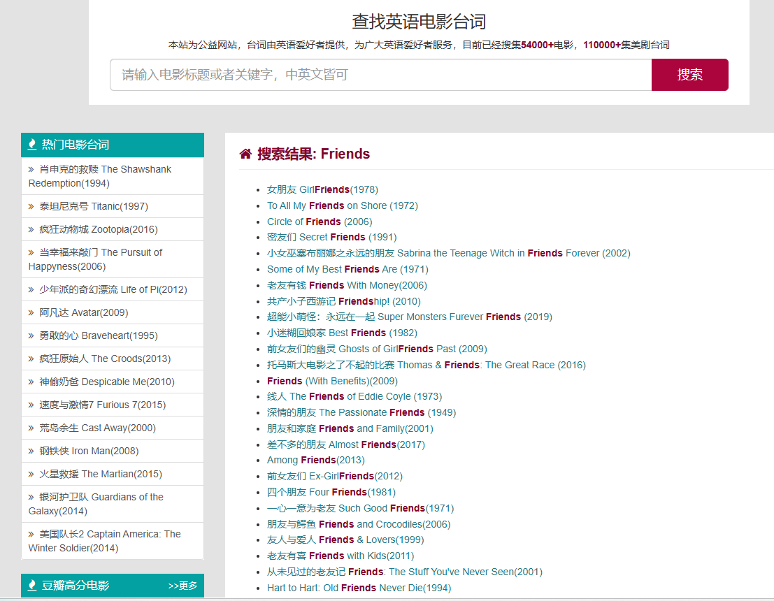 就能搜索出和Friends有关的电影电视剧,额,很明显,这个网站就是给喜欢看电影学英语的人来准备的,并且这是一个公益网站,因为它完全免费