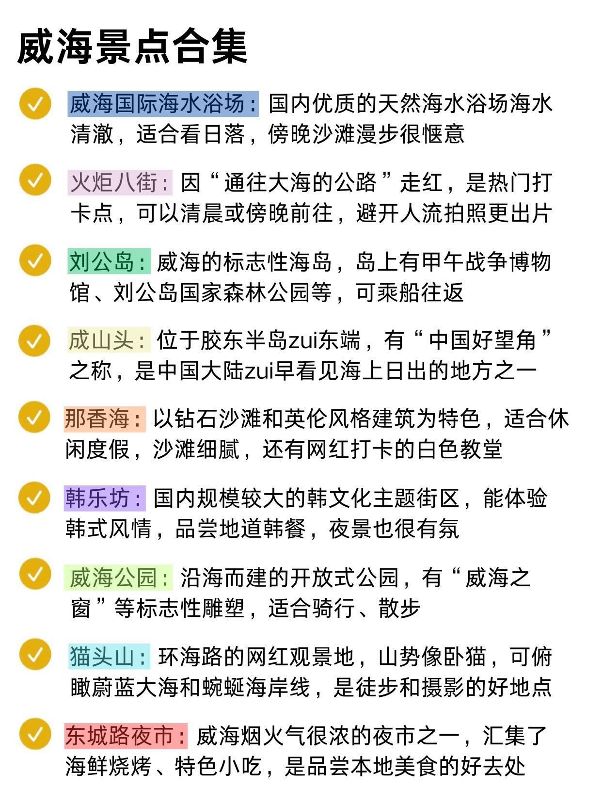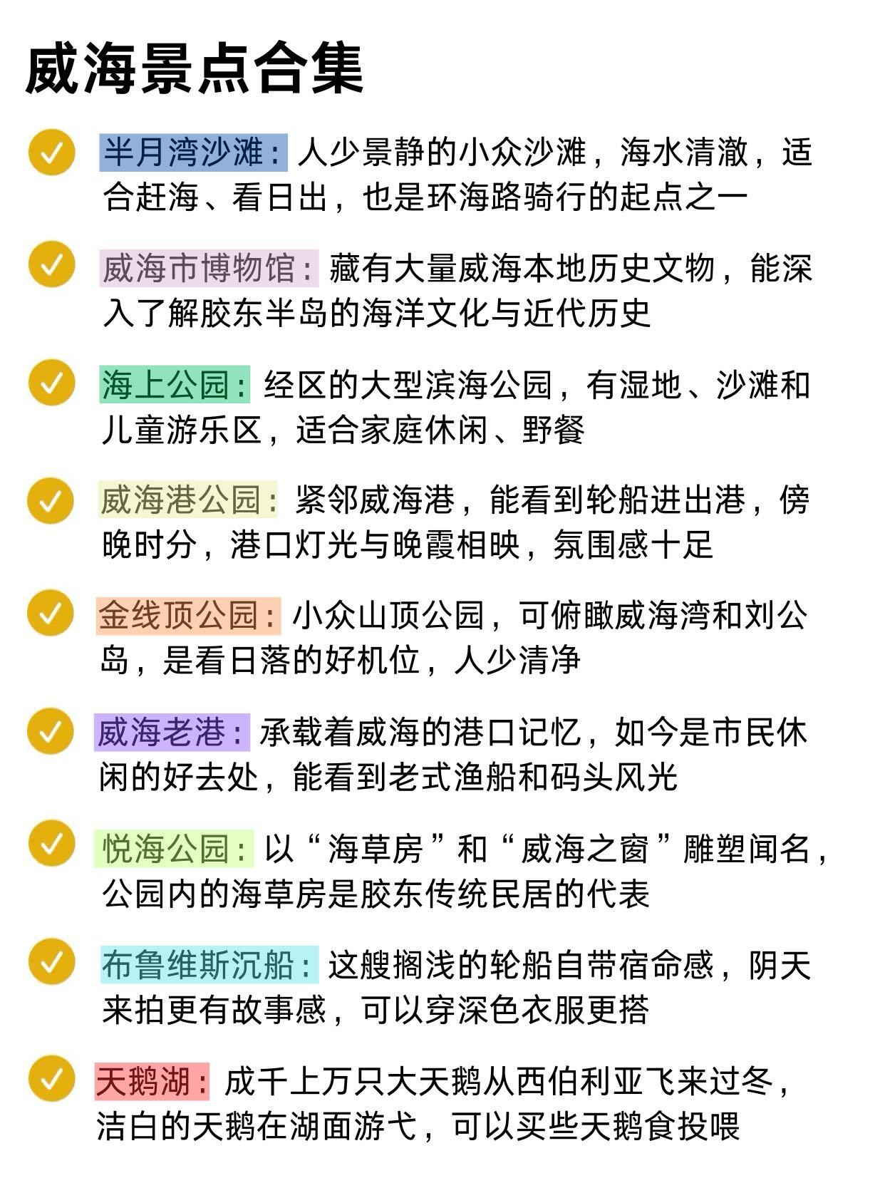 上午打卡刘公岛,甲午战争博物馆要逛逛,历史感拉满。骑会儿车到幸福门,威海地标可以打卡。下午逛威海公园,和大相框合影很有纪念意义📷再骑行到海源公园,渔船、玻璃海、木栈道,怎么拍都好看。晚上直奔韩乐坊,韩料小吃吃到撑😋