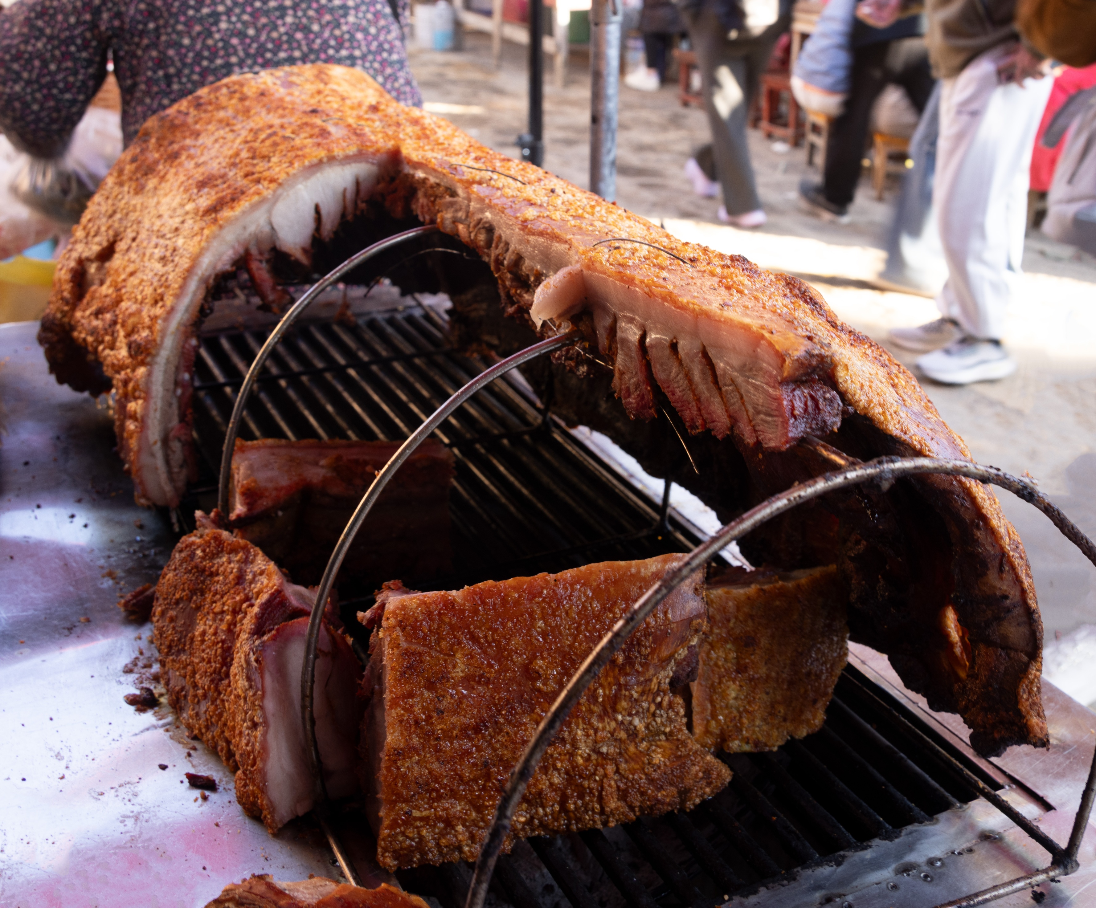 在腾冲,绮罗古镇虽不像和顺古镇那么出名,但人气颇旺。主要是这里有热闹的早市,售卖各种生鲜食品以及物品,且有丰富实惠的特色饮食,我们也特意去吃了一顿早餐。我们随处观望少见的东西,比如特大的豆角,不是用来吃的,而是平安豆。分割烤乳猪颇受欢迎,一整只很快就卖掉了。