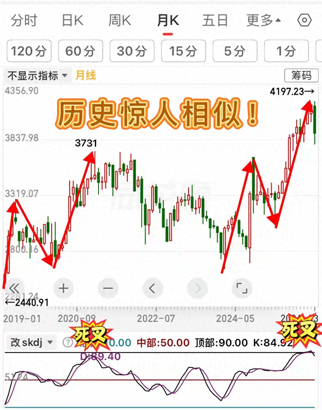 历史总是惊人的相似,把上证指数的月K线图拉长,2026年3月的4197点与2021年2月的3731点,仿佛是一对跨越了五年的“镜像双胞胎”。无论是波浪形态的衰竭,还是技术指标的顶背离,甚至连主力在高位压盘的动作,都如出一辙。这或不仅仅是巧合,更是市场周期律在K线上的冰冷复刻。