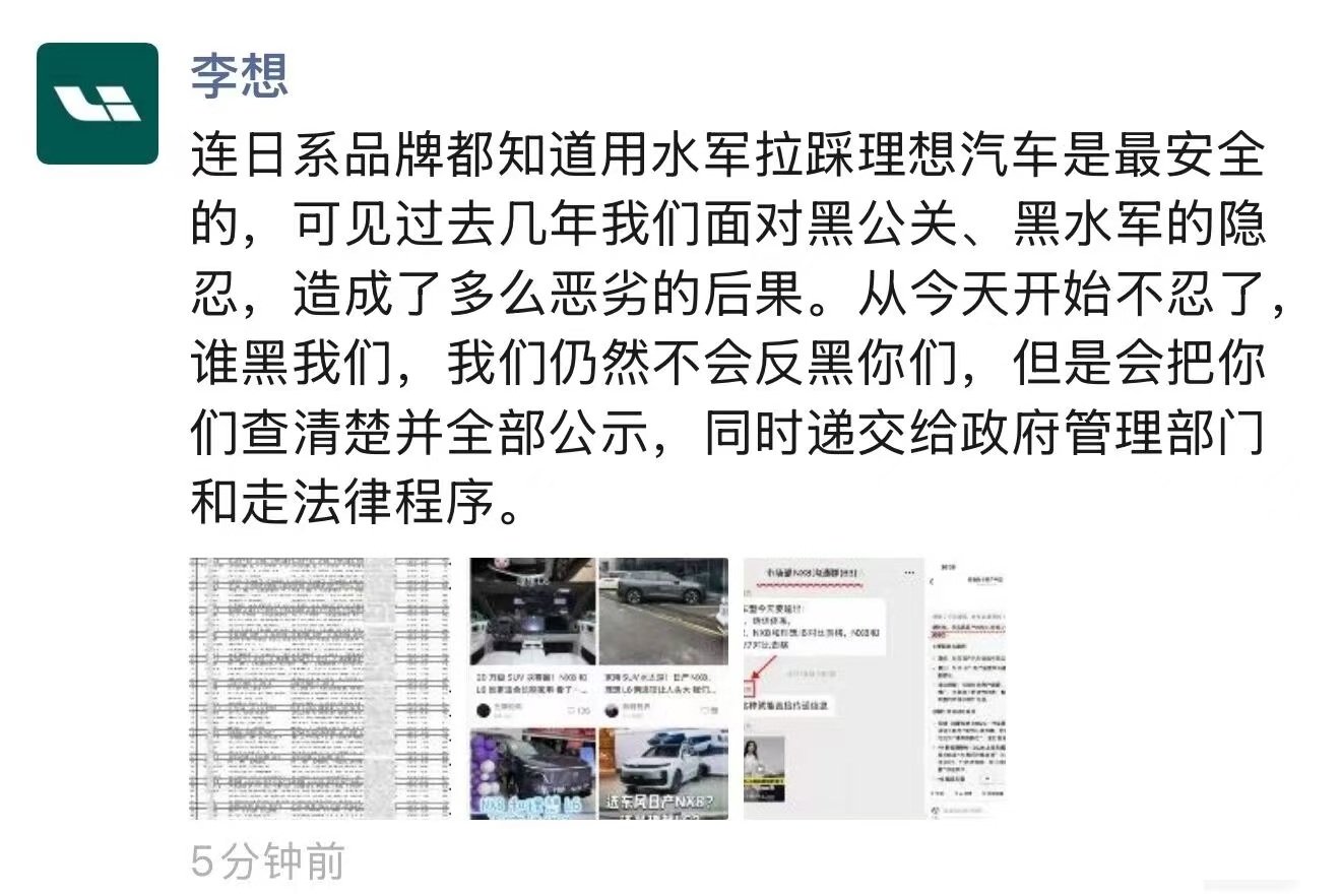 连日系品牌都知道用水军拉踩理想汽车是最安全的,可见过去几年我们面对黑公关、黑水军的隐忍,造成了多么恶劣的后果。从今天开始不忍了,谁黑我们,我们仍然不会反黑你们,但是会把你们查清楚并全部公示,同时递交给政府管理部门和走法律程序。