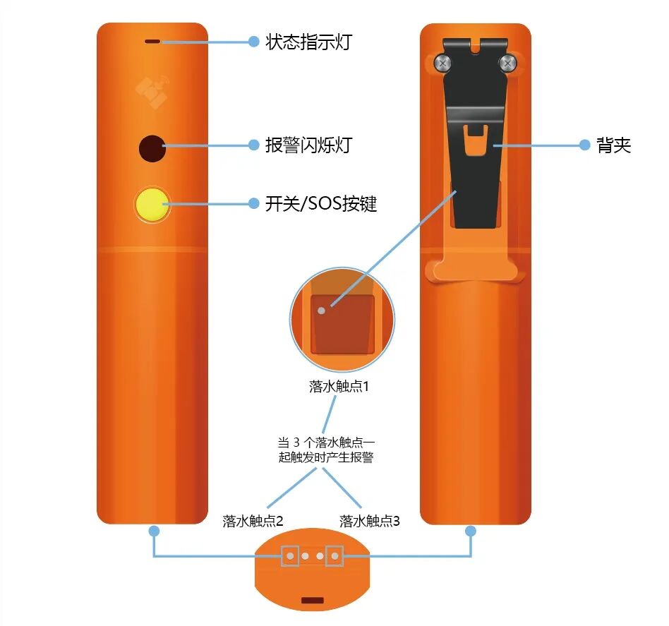 ① 落水报警功能:具有落水检测,自动开机,自动报警
