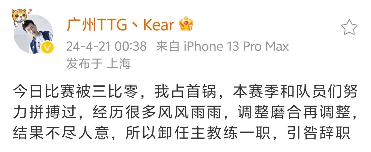 在赛后Kear教练也是在深夜发文,引咎辞职。