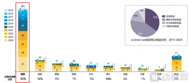 2015-2024年中国药企License-out交易受让方及转让权益分布