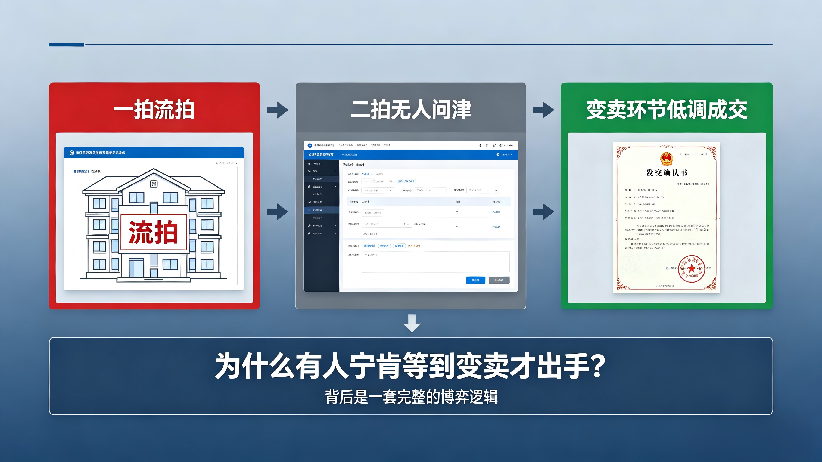 法拍房市场上,最引人注目的往往不是溢价成交的热门房源,而是一路从一拍流拍到二拍无人问津,最终在变卖环节低调成交的那些房子。为什么有人宁肯等到变卖才出手?背后是一套完整的博弈逻辑。
