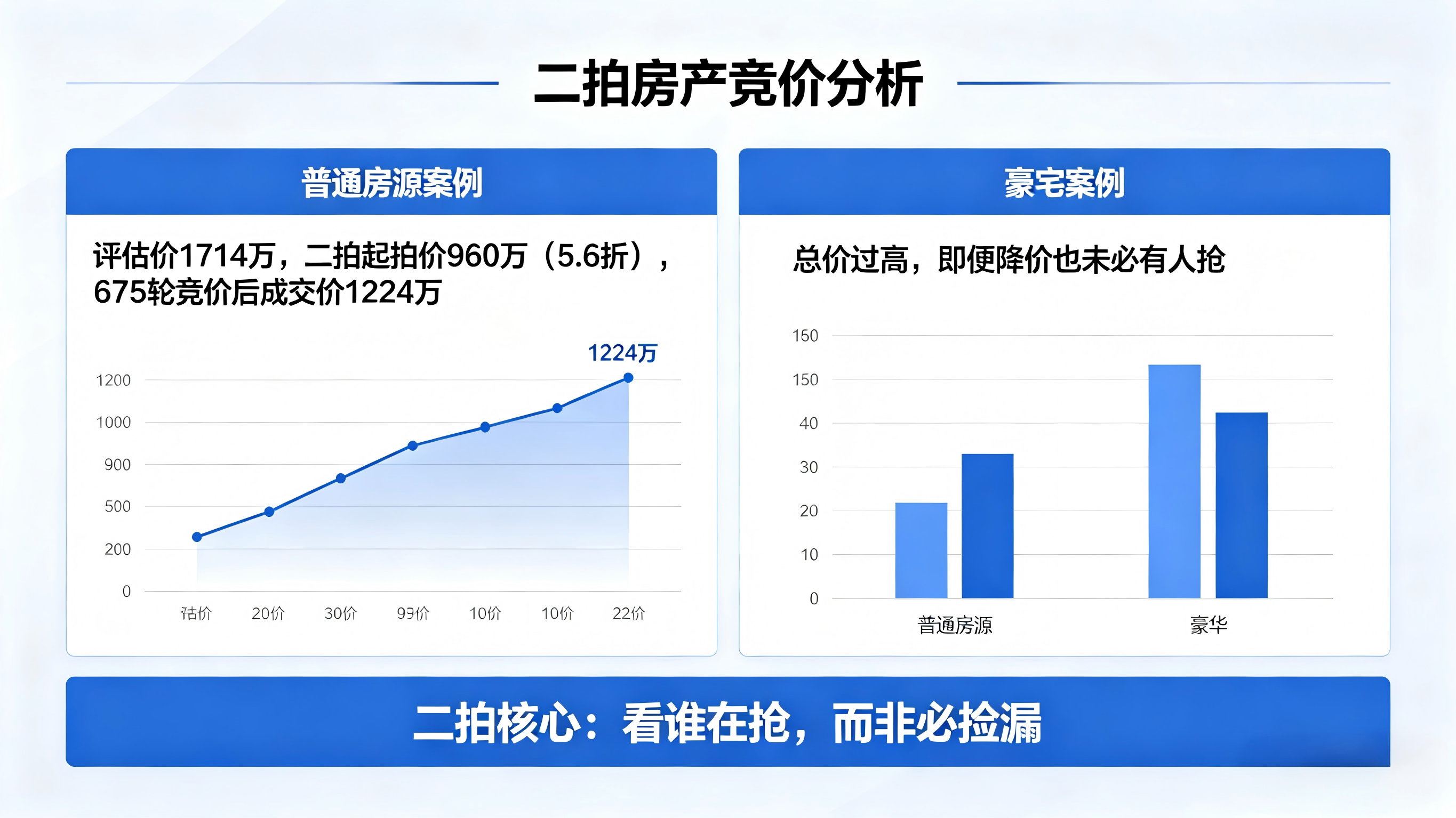 而总价过高的豪宅,即便降价也未必有人抢——二拍的核心是“看谁在抢”,而非“必捡漏”。
