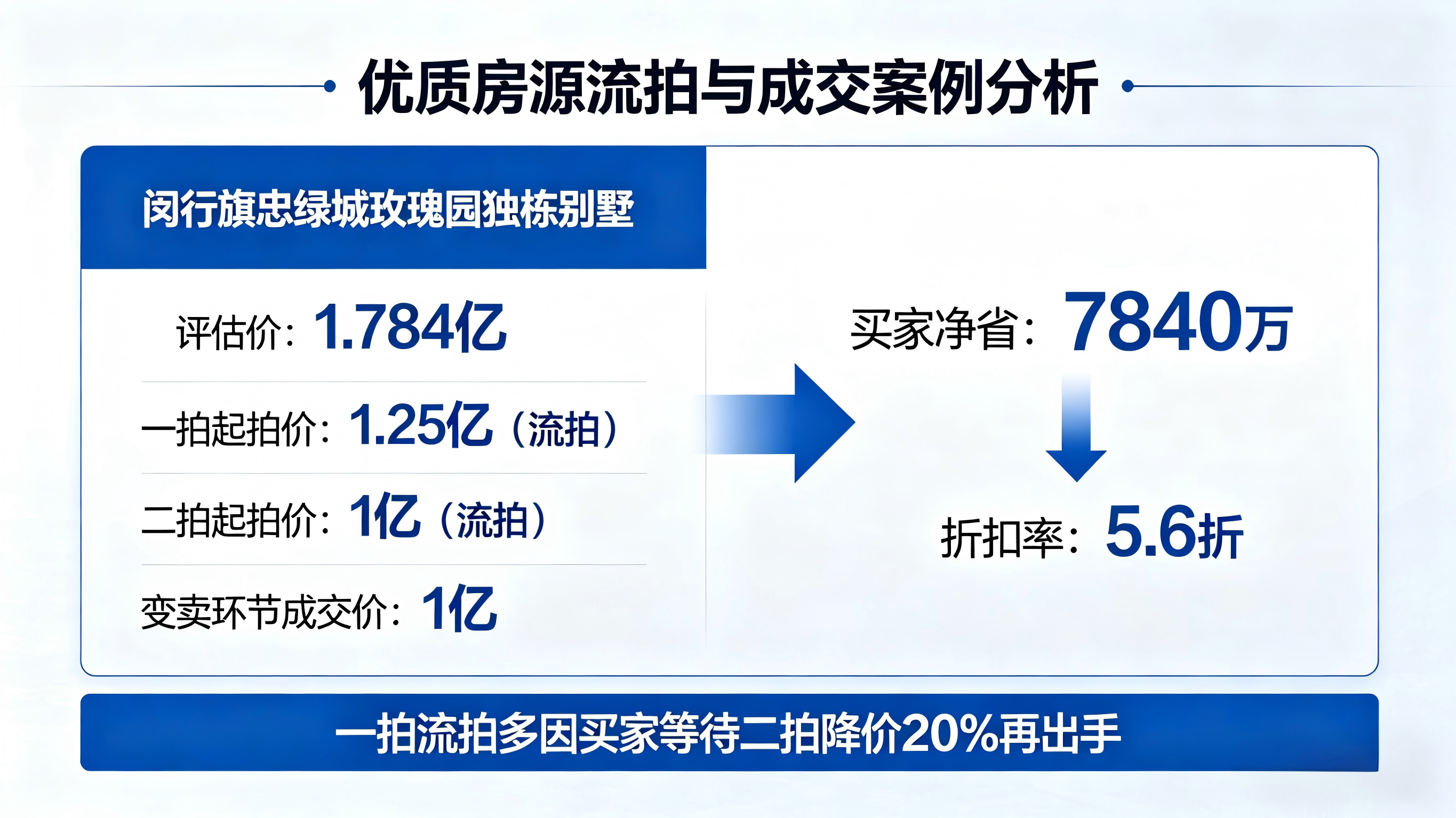 二、一拍流拍:不是没人要,是买家在等降价很多优质房源一拍流拍,并非房子有问题,而是买家太精明——等二拍降价20%再出手。例如闵行旗忠绿城玫瑰园独栋别墅,评估价1.784亿,一拍起拍1.25亿流拍;
