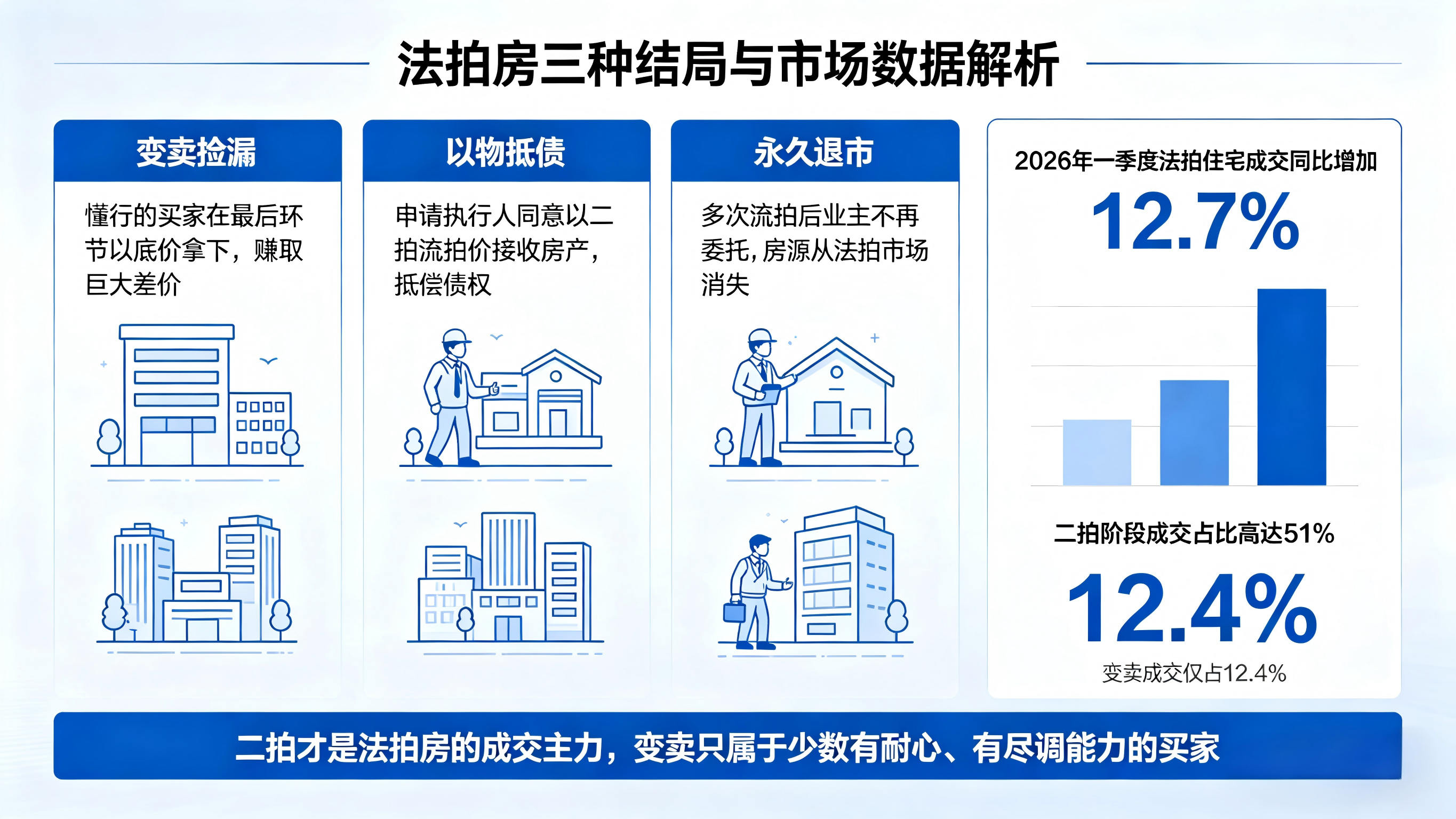从市场整体看,2026年一季度法拍住宅成交同比增加12.7%,二拍阶段成交占比高达51%,变卖成交仅占12.4%。二拍才是法拍房的成交主力,变卖只属于少数有耐心、有尽调能力的买家。