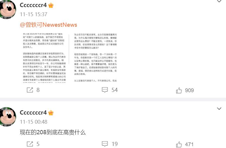 这位工作人员甚至收到了来自曾轶可公司的告知函,要求其“闭嘴”。