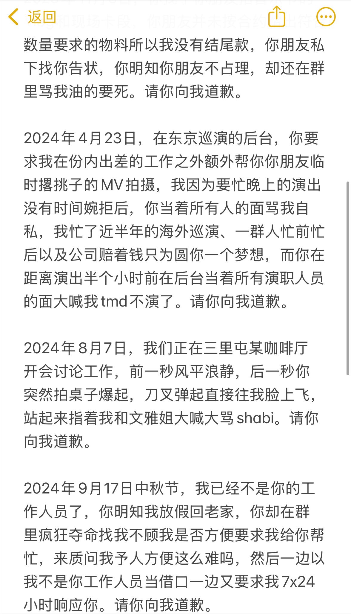 在长文中,该网友控诉曾轶可长期情绪失控,在公开场合对工作人员进行言语羞辱、人身攻击和威胁。